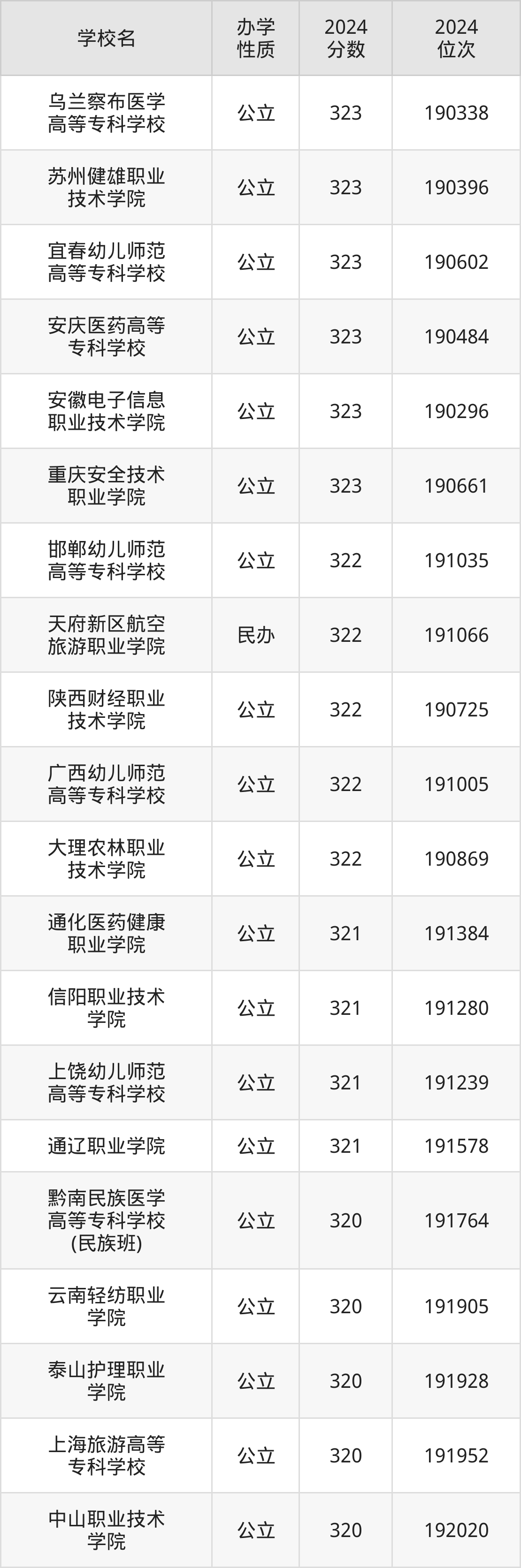 | 安徽电子信息 职业技术学院 | 323 | 190296 |