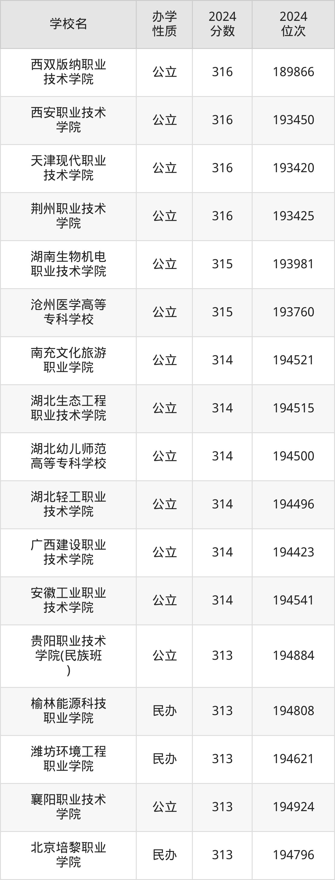 | 湖北生态工程 职业技术学院 | 314 | 194515 |
