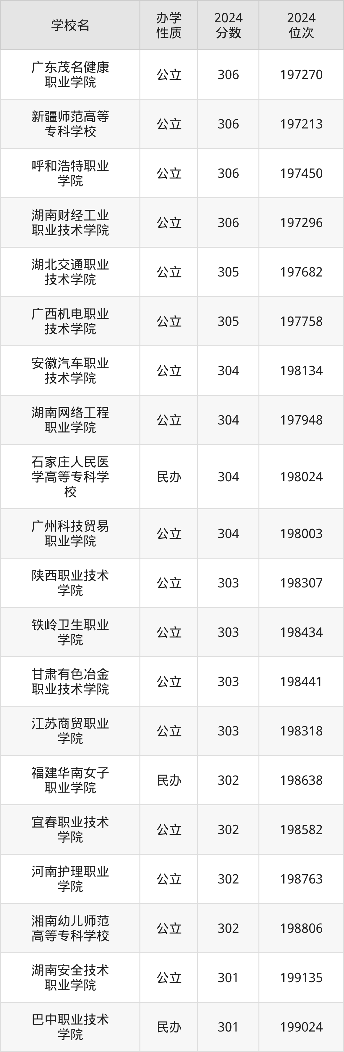 | 广东茂名健康 职业学院 | 306 | 197270 |