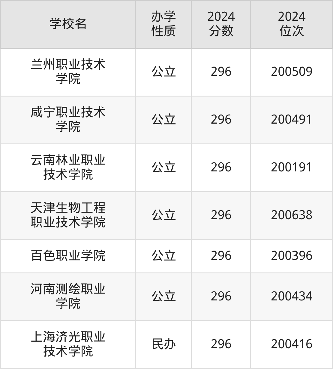 | 云南林业职业 技术学院 | 296 | 200191 |