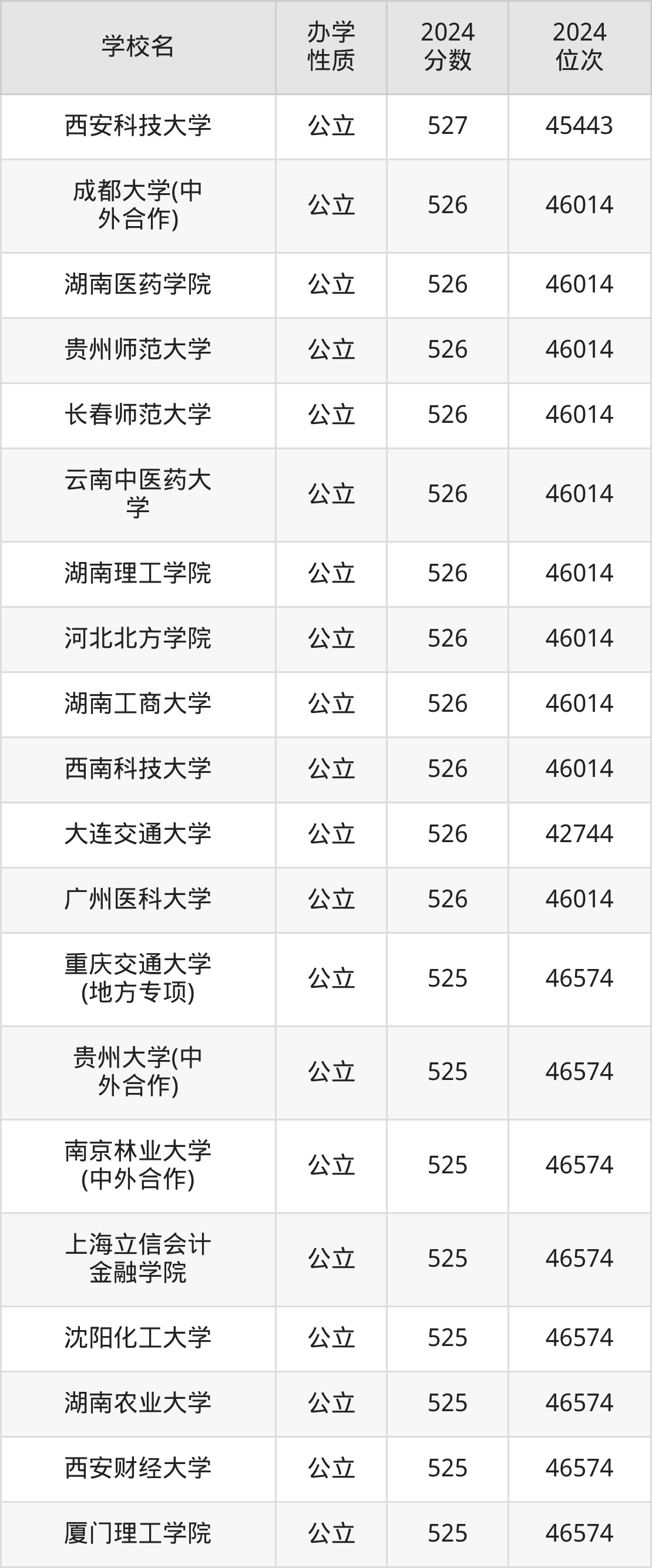 | 贵州大学(中 外合作) | 525 | 46574 |