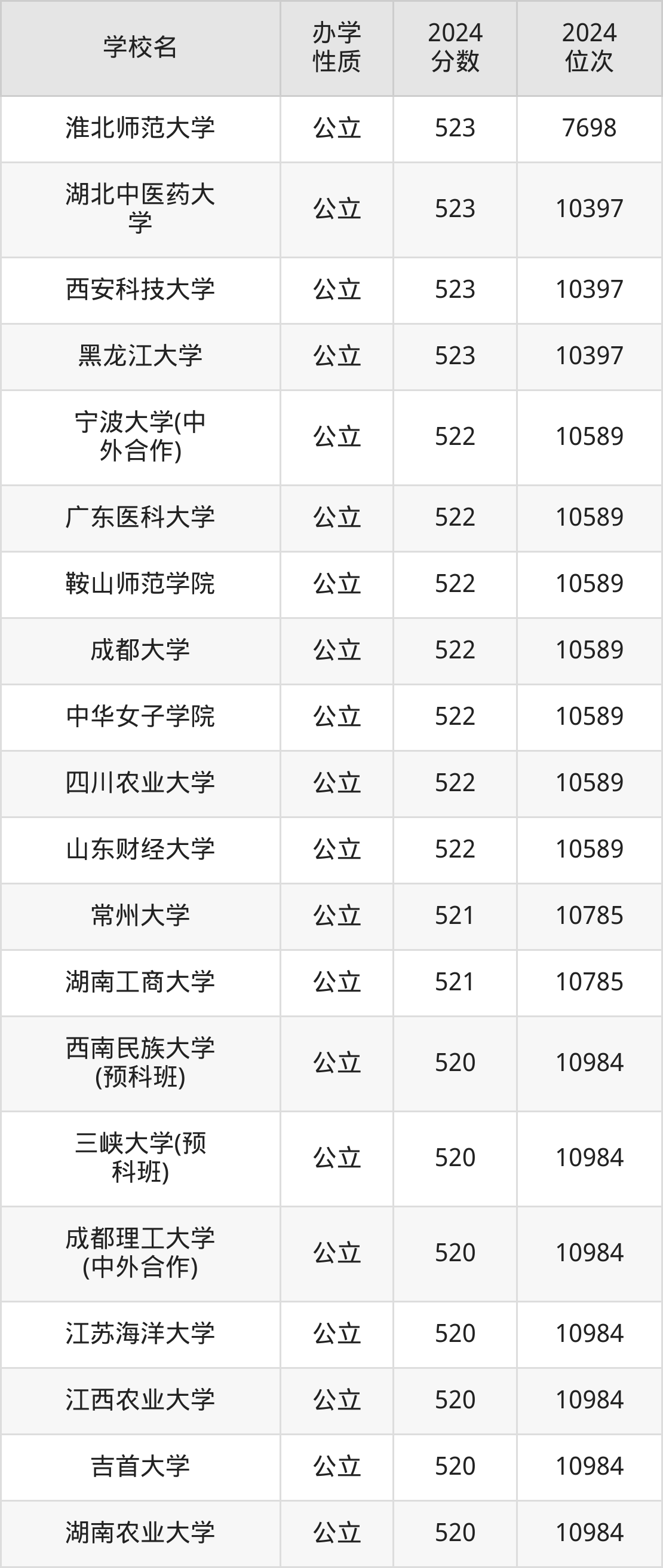 | 西南民族大学 (预科班) | 520 | 10984 |