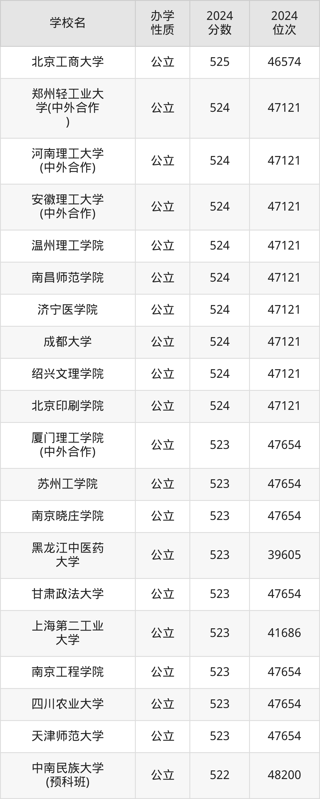 | 郑州轻工业大 学(中外合作 ) | 524 | 47121 |