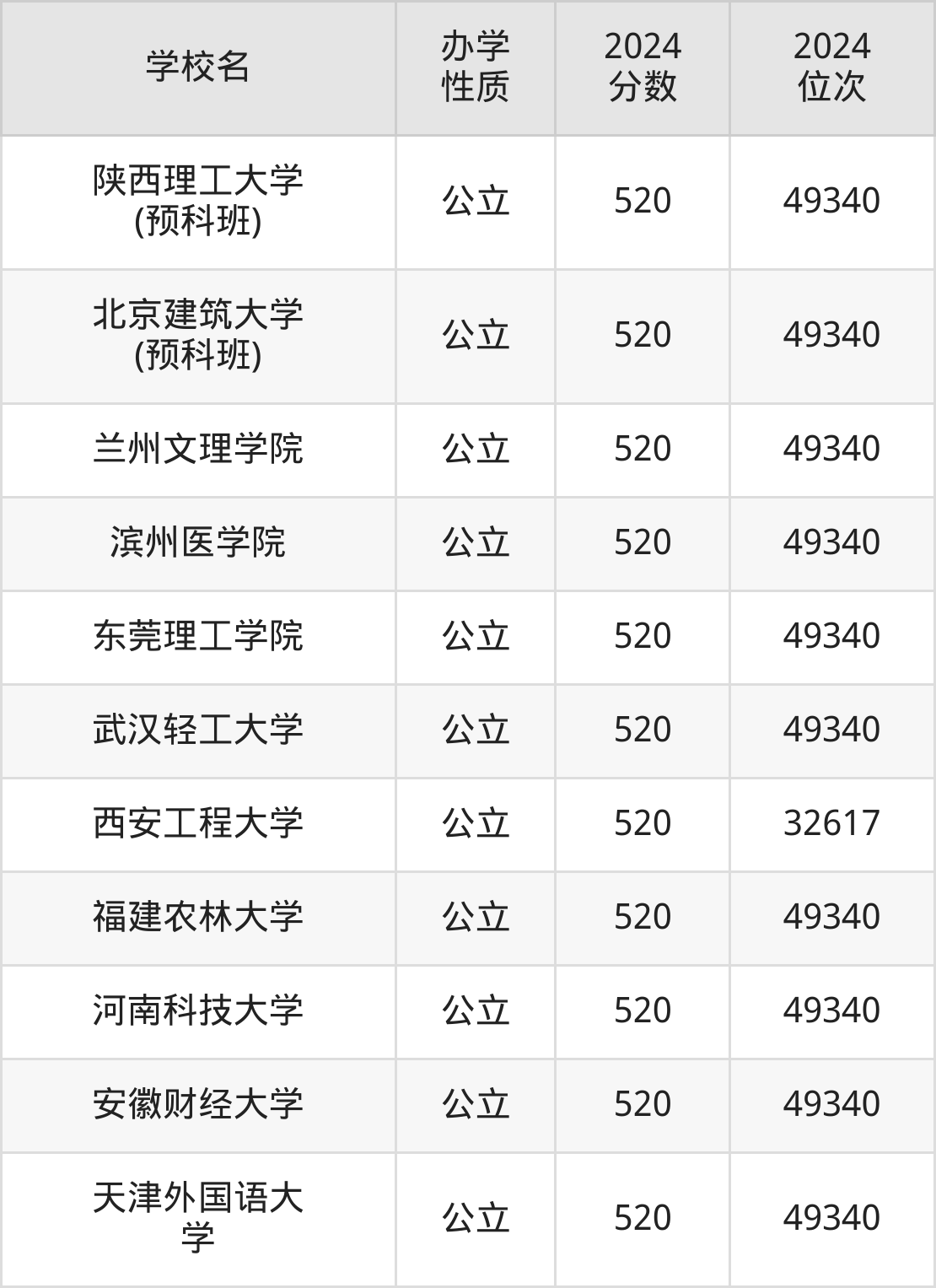 | 陕西理工大学 (预科班) | 520 | 49340 |