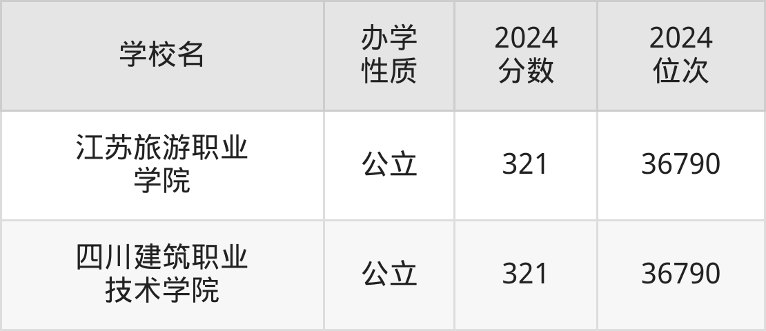 | 江苏旅游职业 学院 | 321 | 36790 |