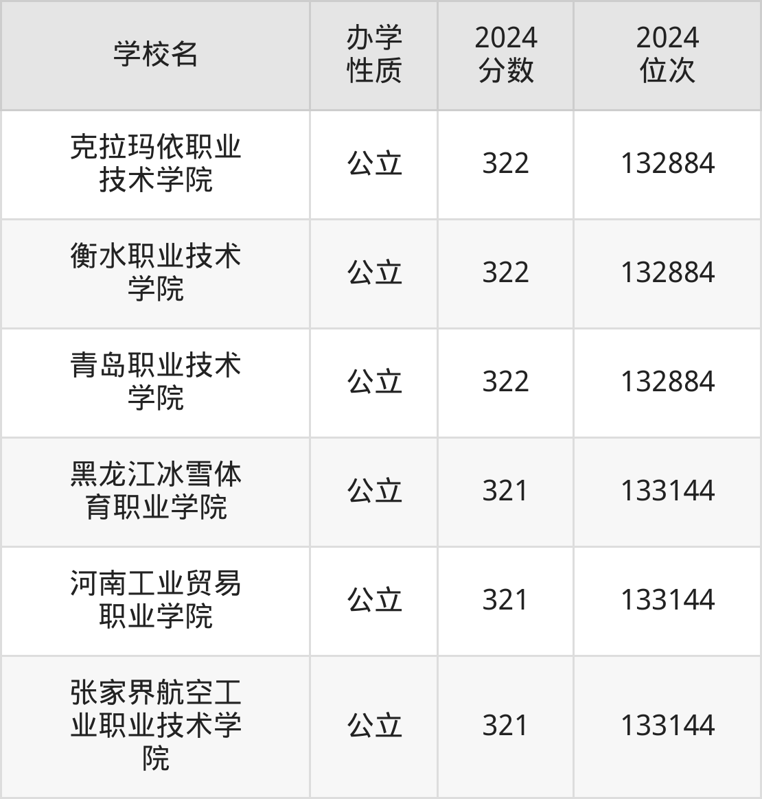 | 黑龙江冰雪体 育职业学院 | 321 | 133144 |