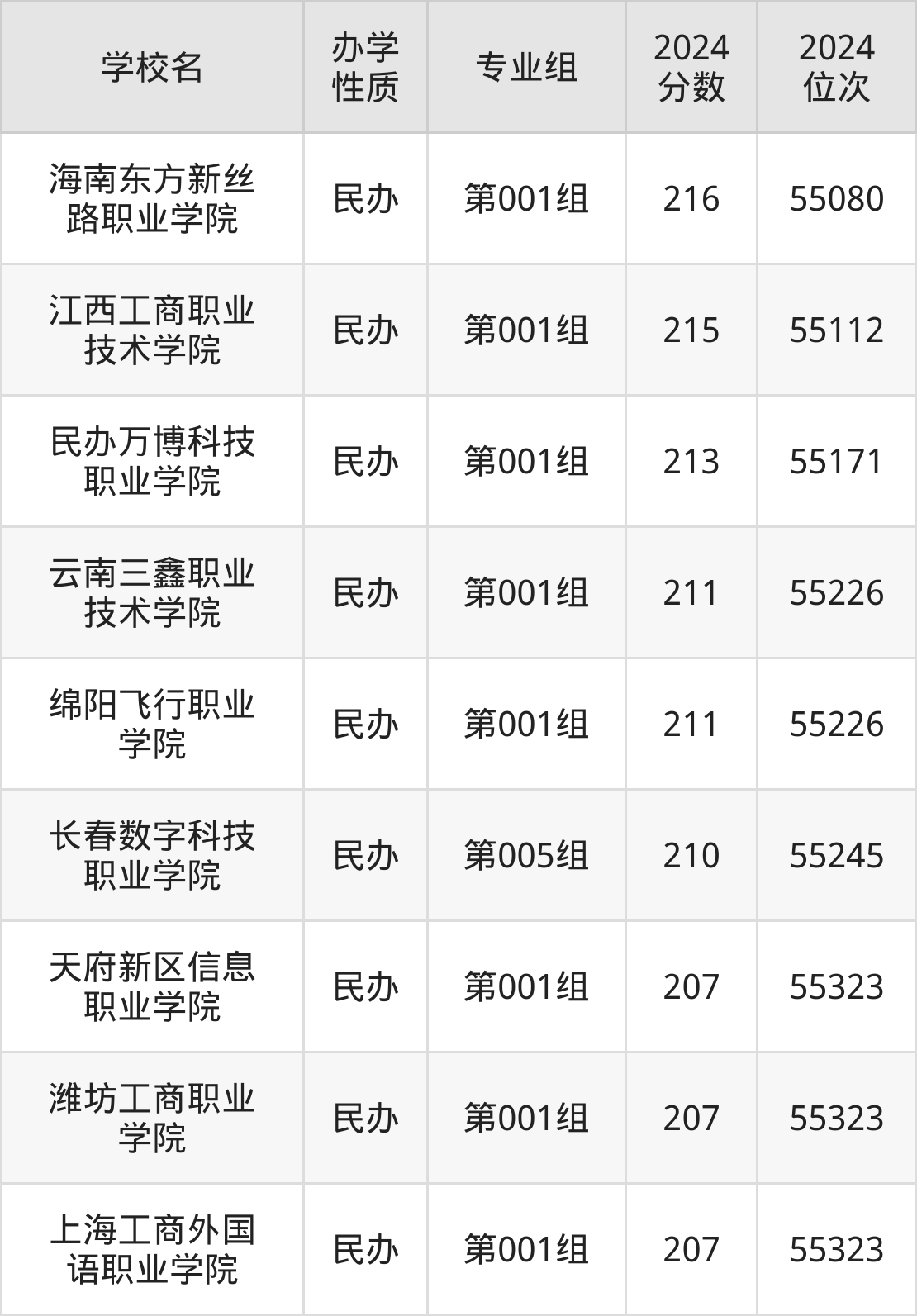 | 海南东方新丝 路职业学院 | 第001组 | 216 | 55080 |
