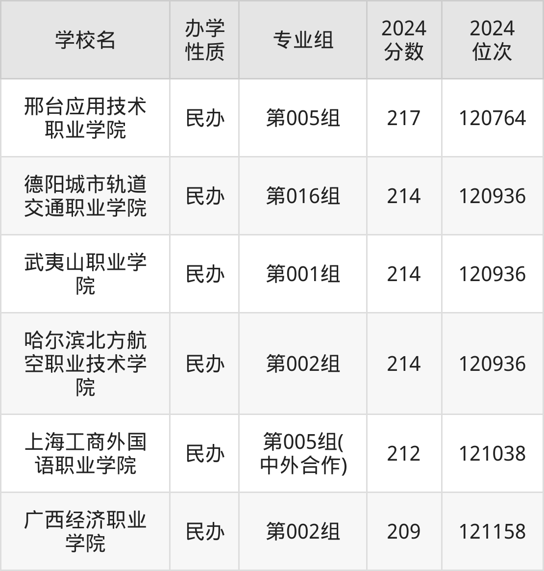2024年黑龙江物理类212分考生能上邢台应用技术职业学院、德阳城市轨道交通职业学院、武夷山职业学院、哈尔滨北方航空职业技术学院、上海工商外国语职业学院等6所专科院校,具体录取分数线及位次为: