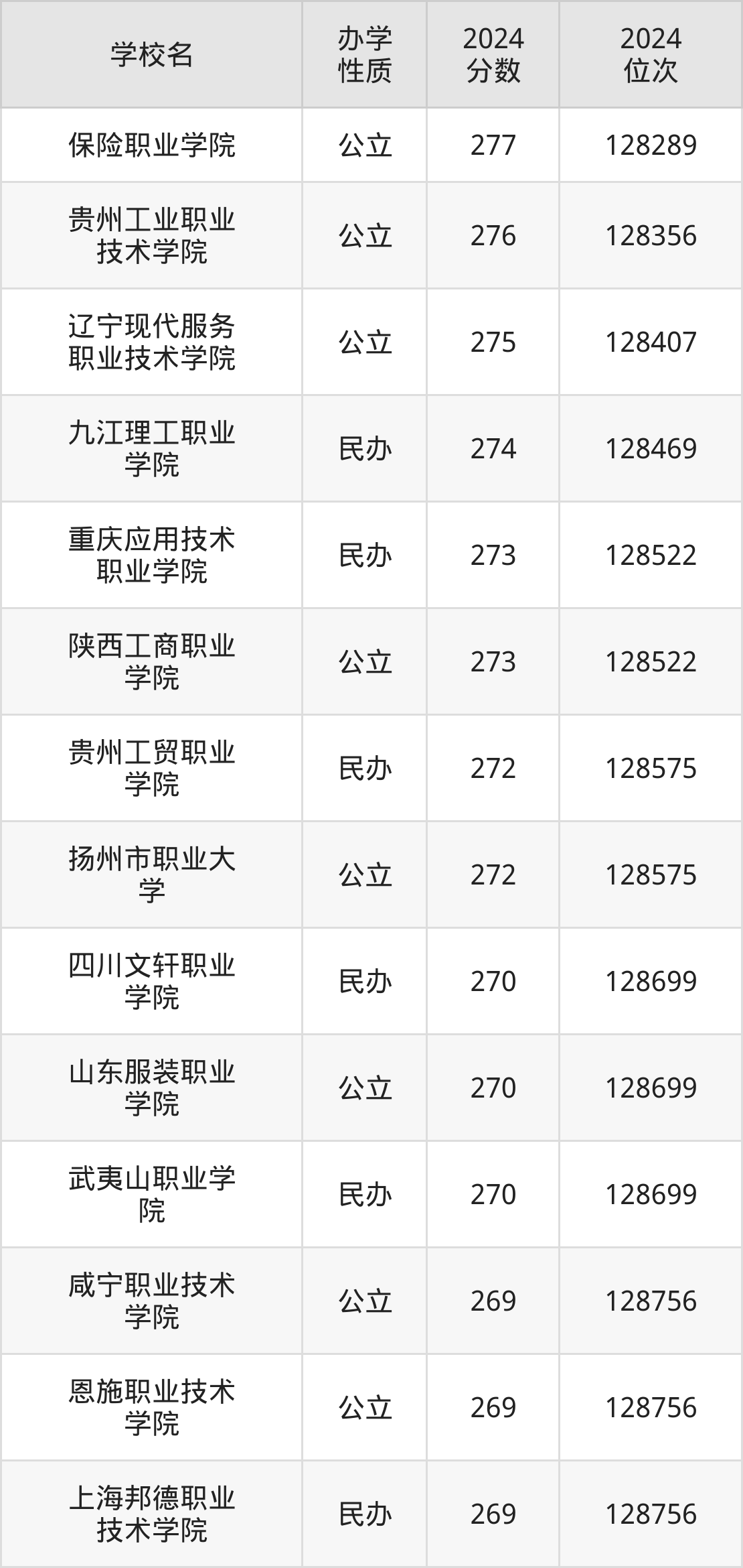 2024年云南文科272分考生能上保险职业学院、贵州工业职业技术学院、辽宁现代服务职业技术学院、九江理工职业学院、重庆应用技术职业学院等14所专科院校,具体录取分数线及位次为: