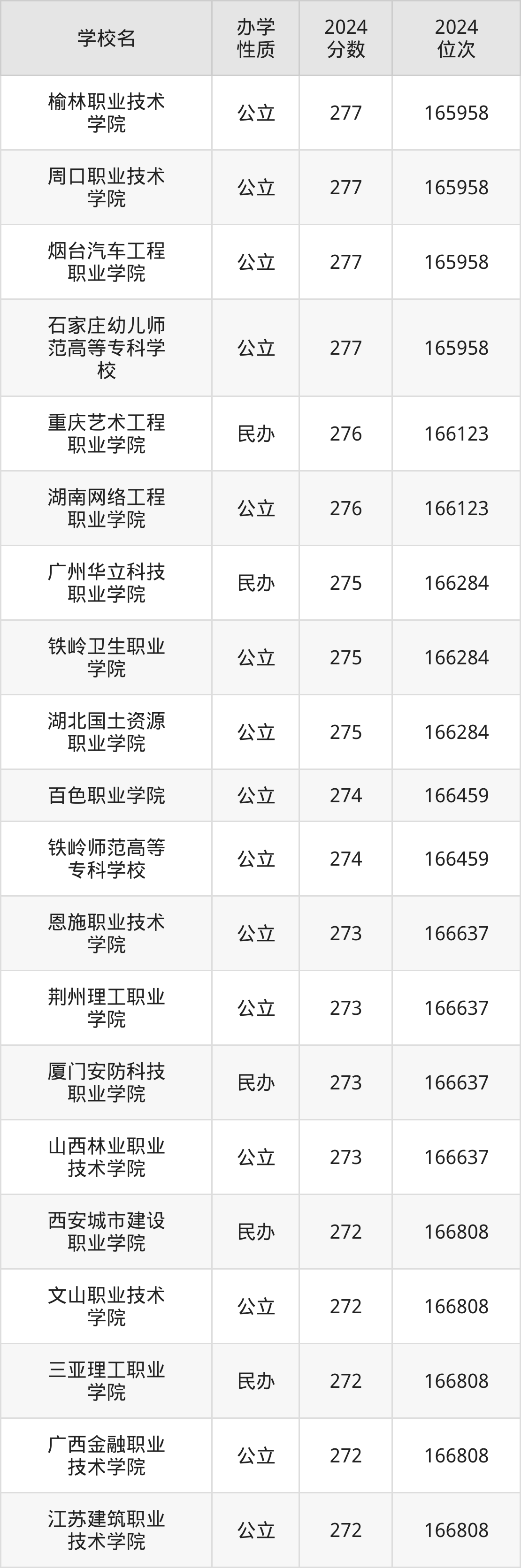 | 湖北国土资源 职业学院 | 275 | 166284 |