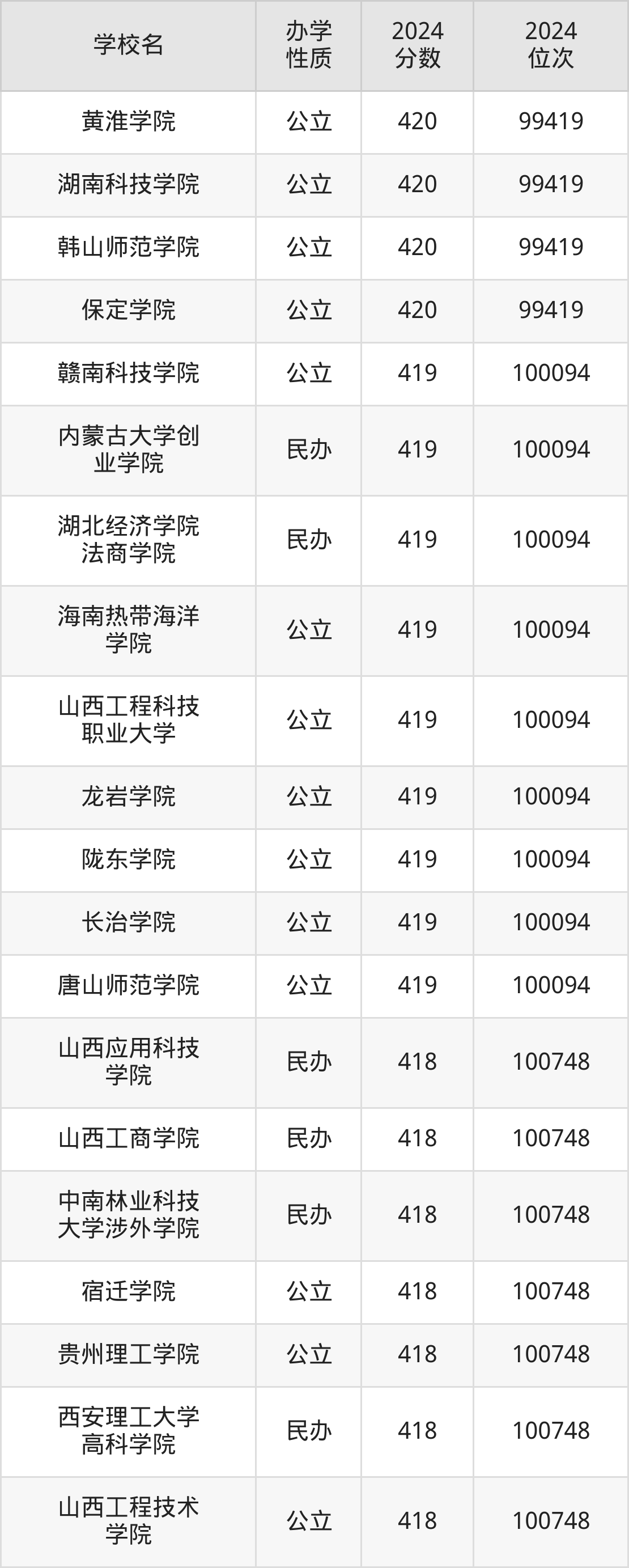 | 山西工程技术 学院 | 418 | 100748 |