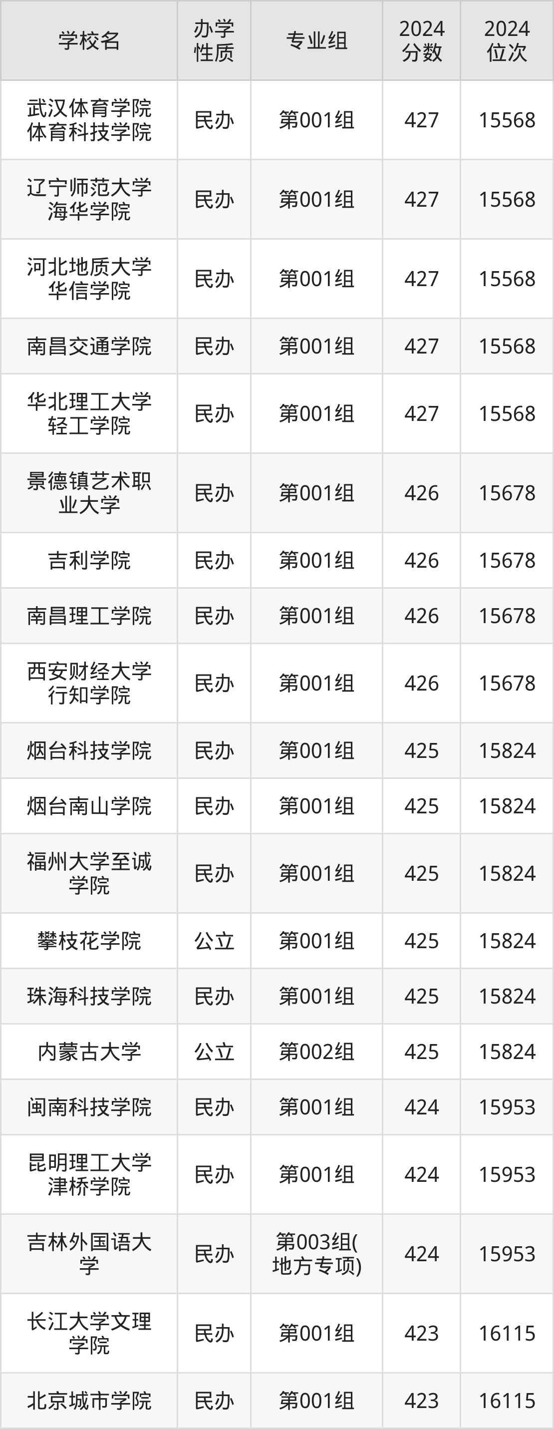 | 吉林外国语大 学 | 第003组( 地方专项) | 424 | 15953 |