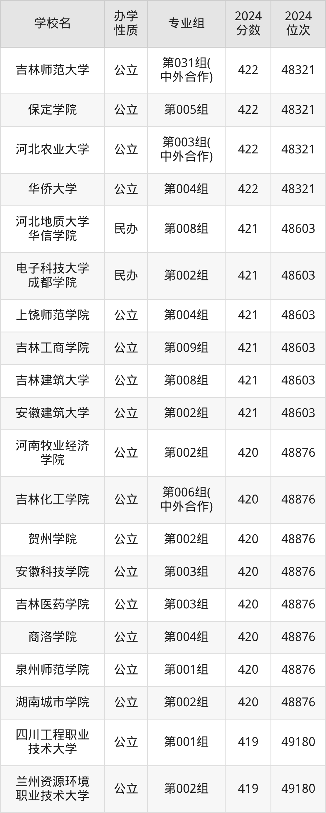 吉林物理类422分左右能上的大学名单:
