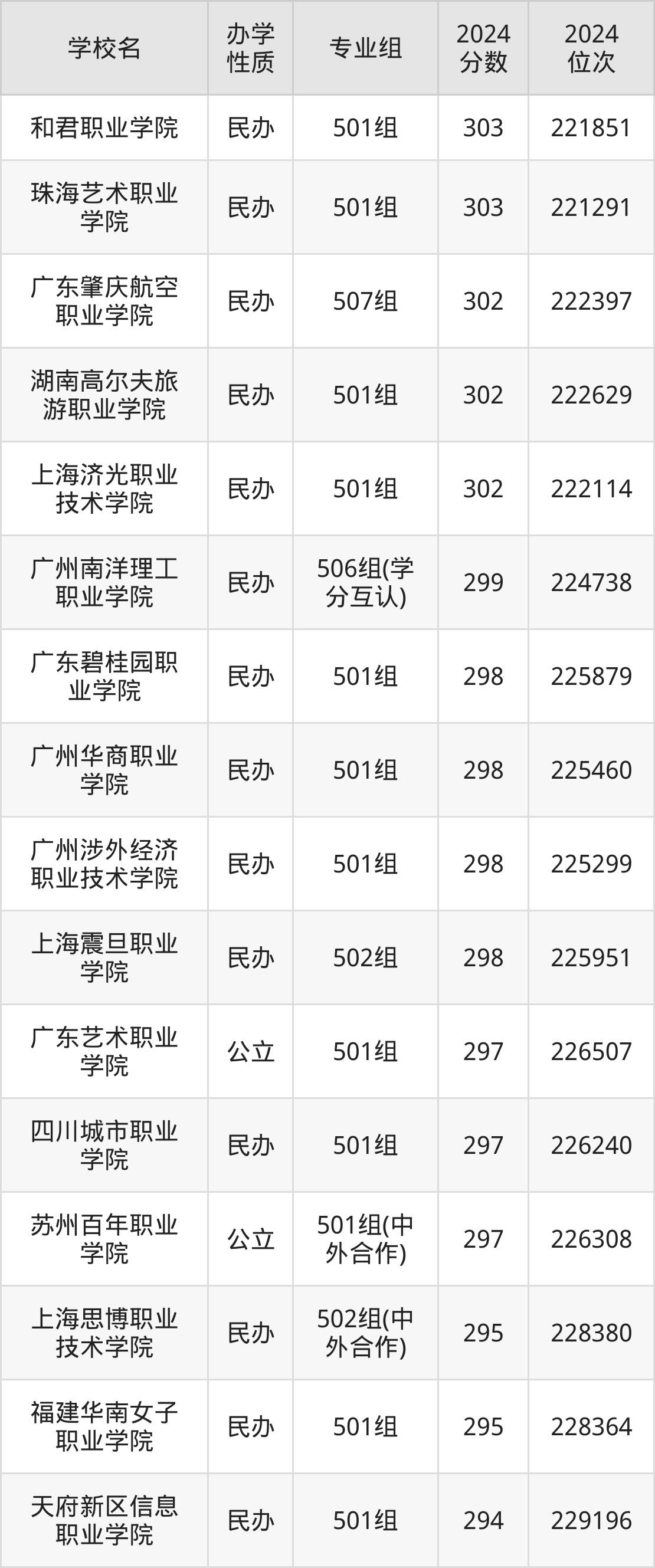 2024年广东历史类298分考生能上和君职业学院、珠海艺术职业学院、广东肇庆航空职业学院、湖南高尔夫旅游职业学院、上海济光职业技术学院等16所专科院校,具体录取分数线及位次为: