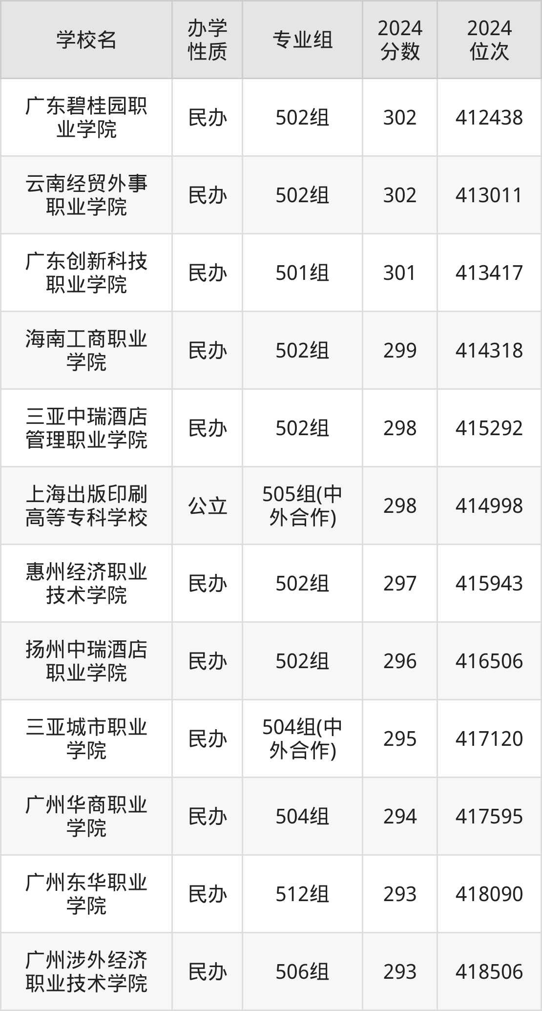 2024年广东物理类298分考生能上广东碧桂园职业学院、云南经贸外事职业学院、广东创新科技职业学院、海南工商职业学院、三亚中瑞酒店管理职业学院等12所专科院校,具体录取分数线及位次为: