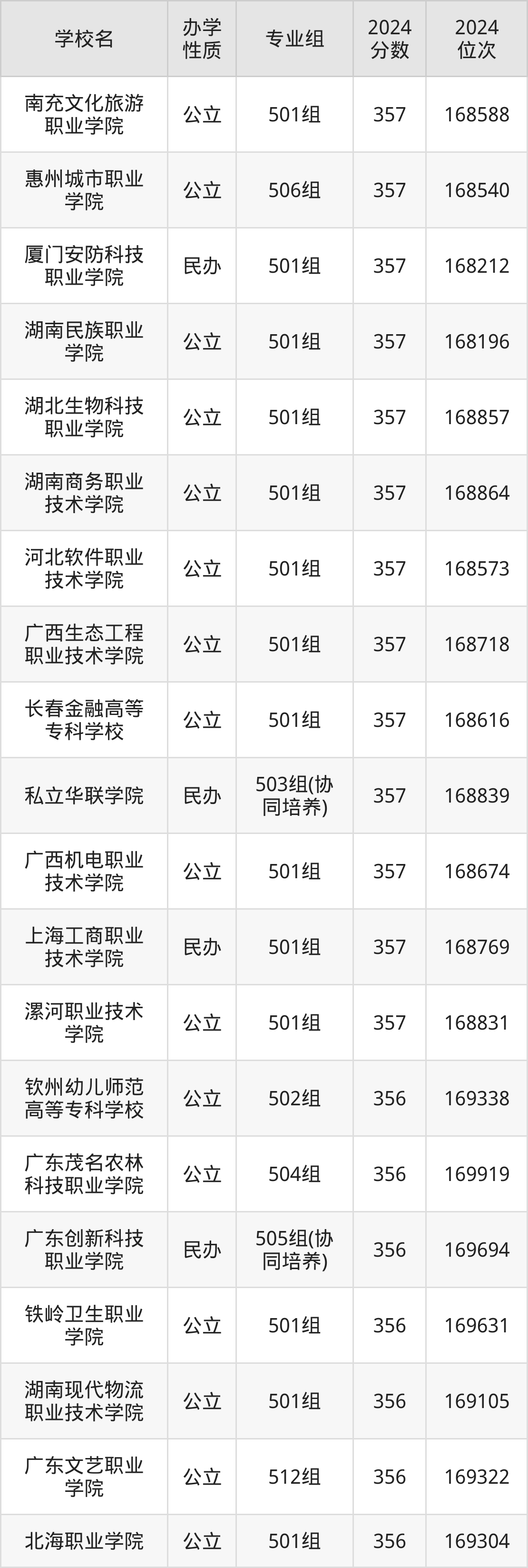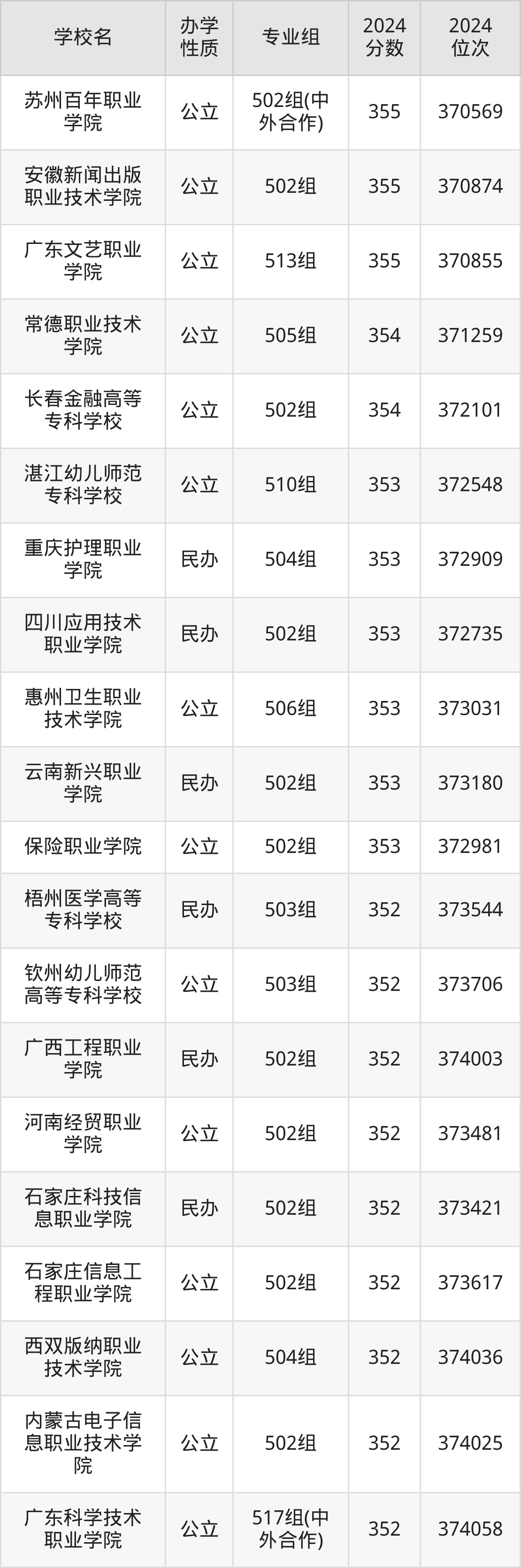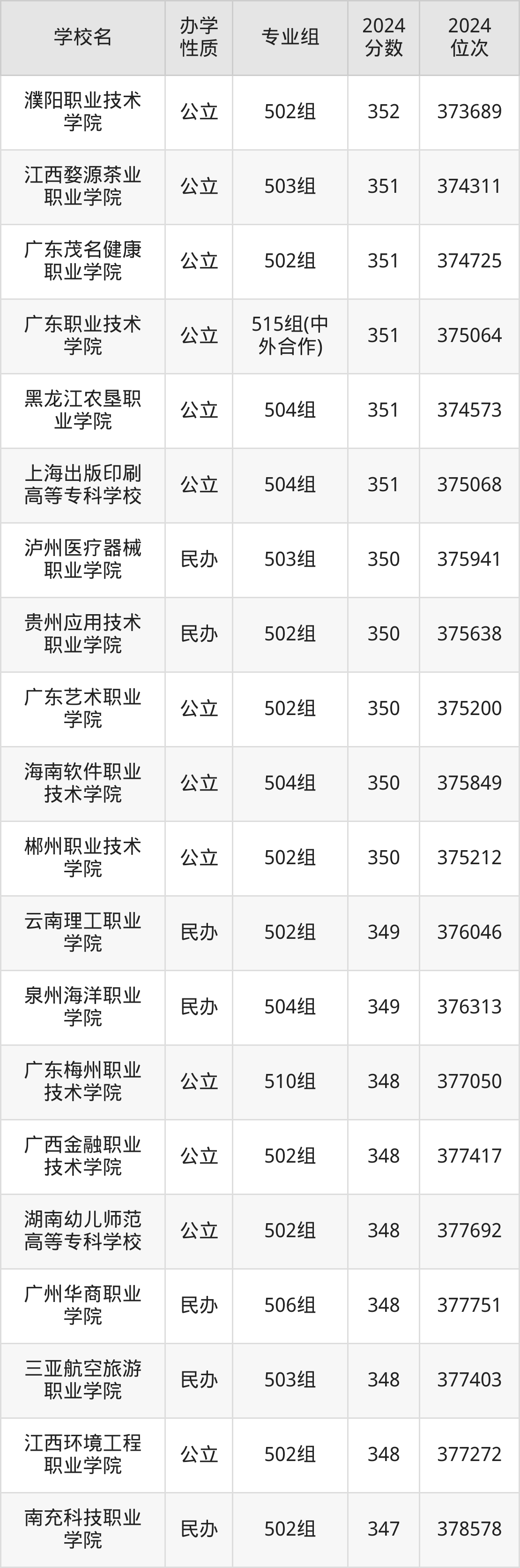 2024年广东历史类352分考生能上南充文化旅游职业学院、惠州城市职业学院、厦门安防科技职业学院、湖南民族职业学院、湖北生物科技职业学院等110所专科院校,具体录取分数线及位次为: