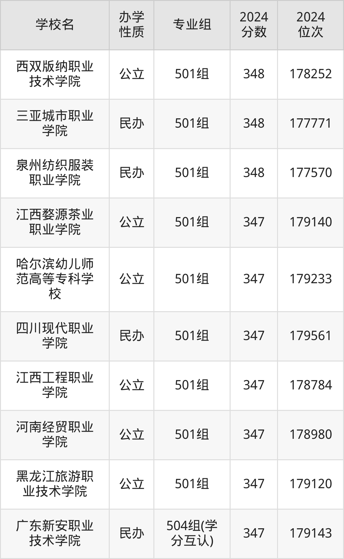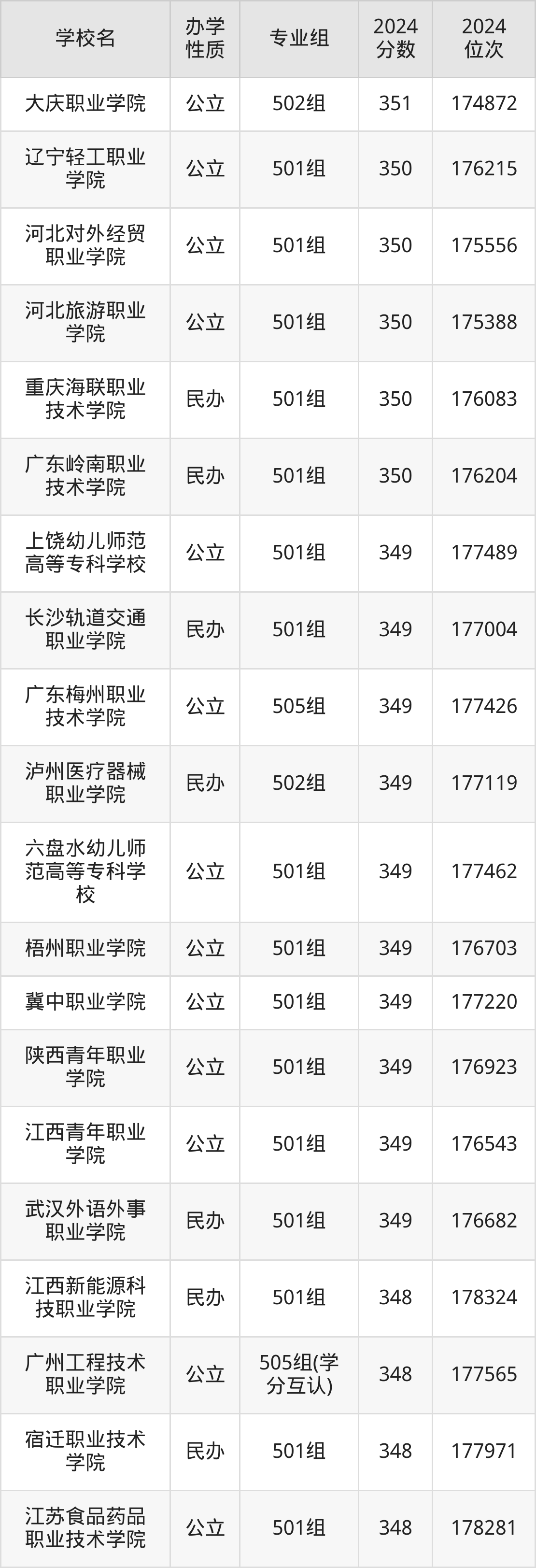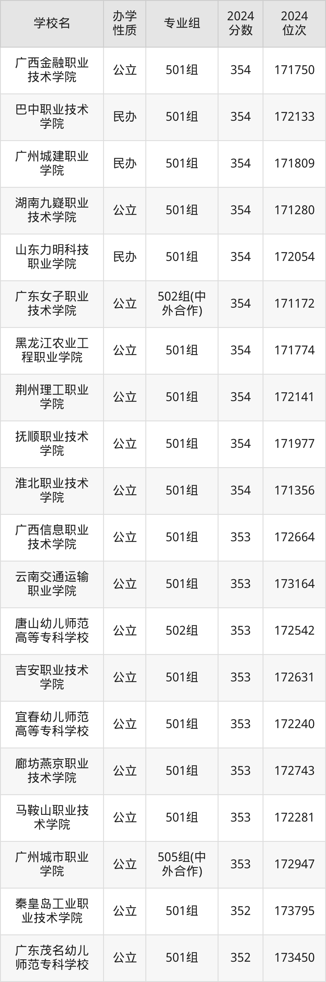 2024年广东历史类352分考生能上南充文化旅游职业学院、惠州城市职业学院、厦门安防科技职业学院、湖南民族职业学院、湖北生物科技职业学院等110所专科院校,具体录取分数线及位次为: