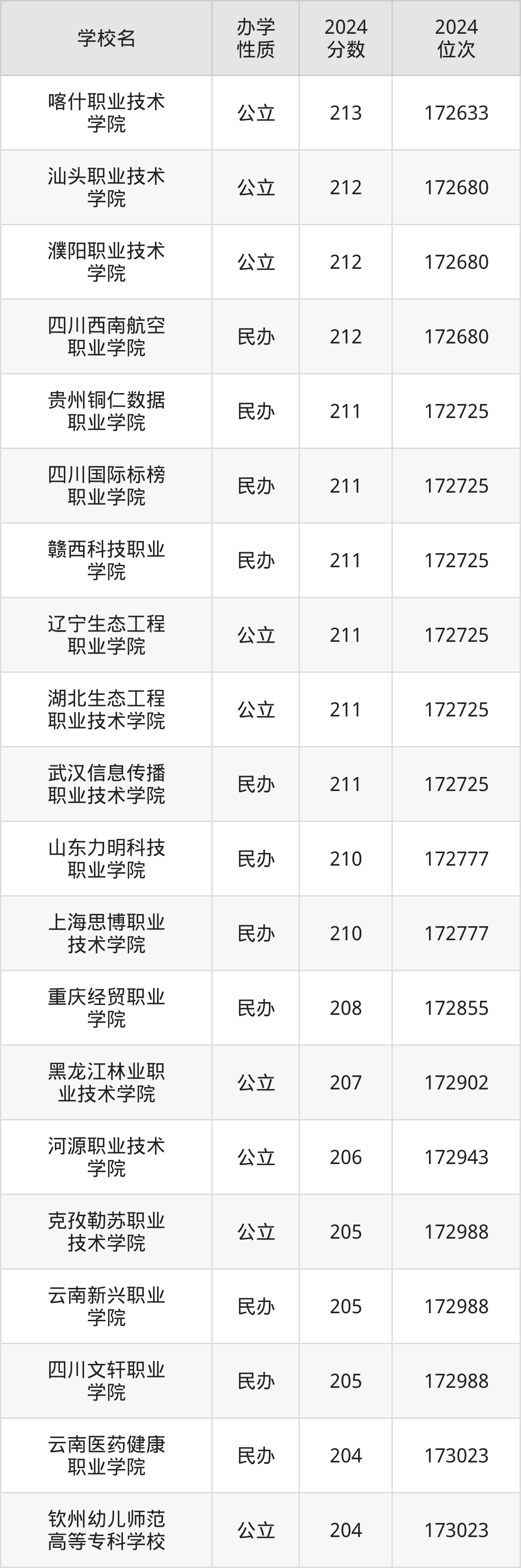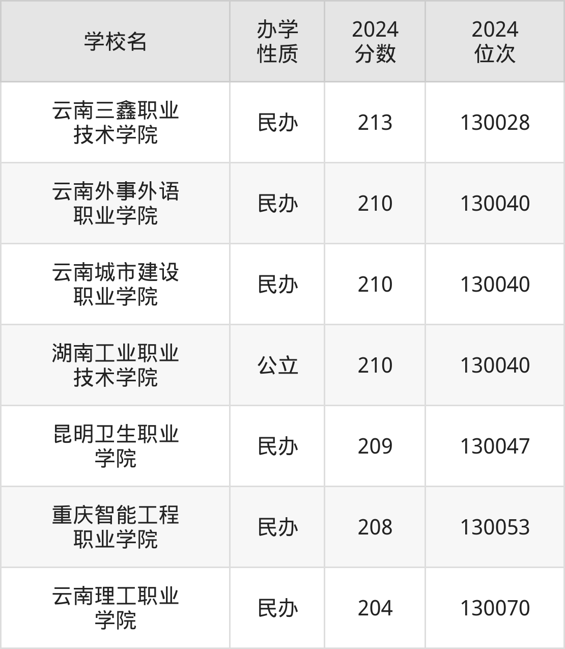 | 云南医药健康 职业学院 | 204 | 173023 |