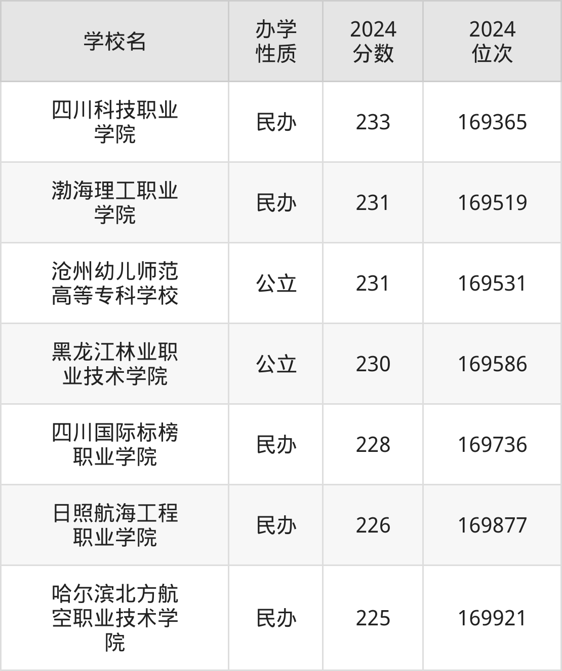 2024年陕西理科229分考生能上四川科技职业学院、渤海理工职业学院、沧州幼儿师范高等专科学校、黑龙江林业职业技术学院、四川国际标榜职业学院等7所专科院校,具体录取分数线及位次为: