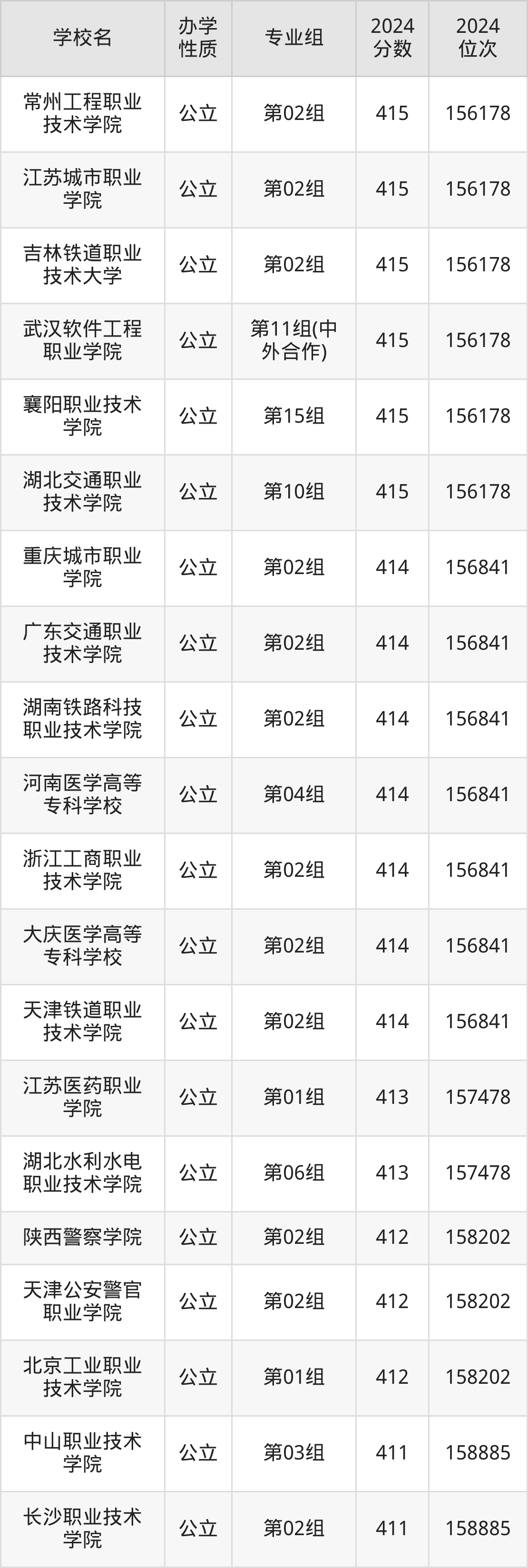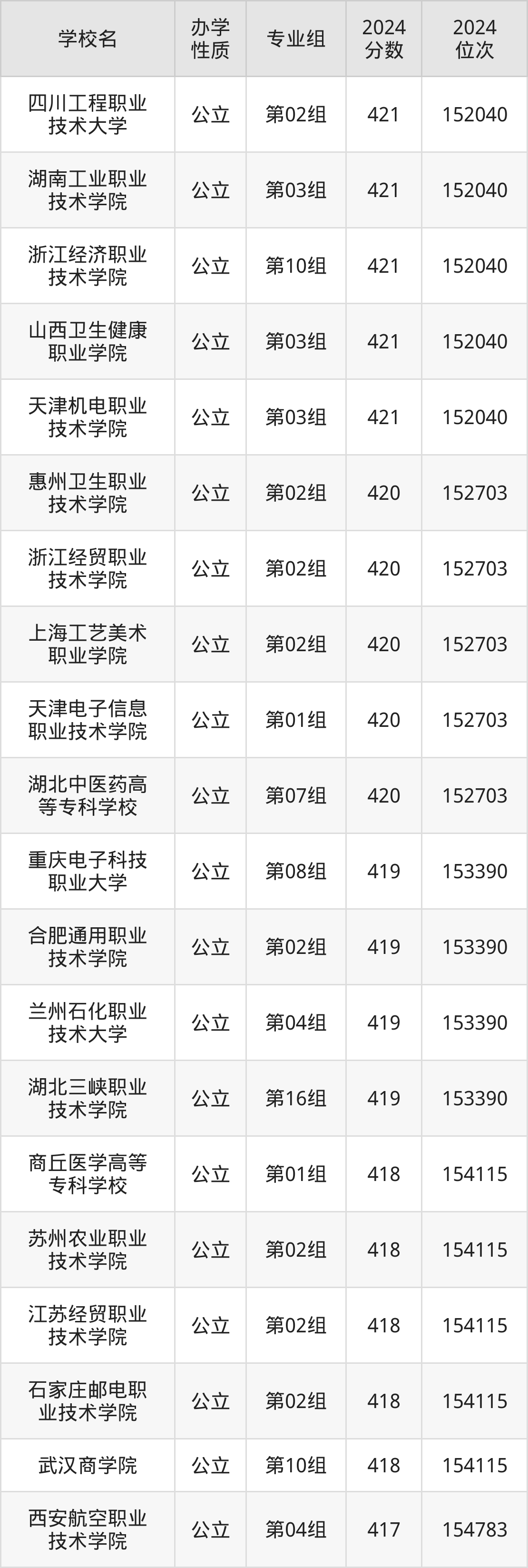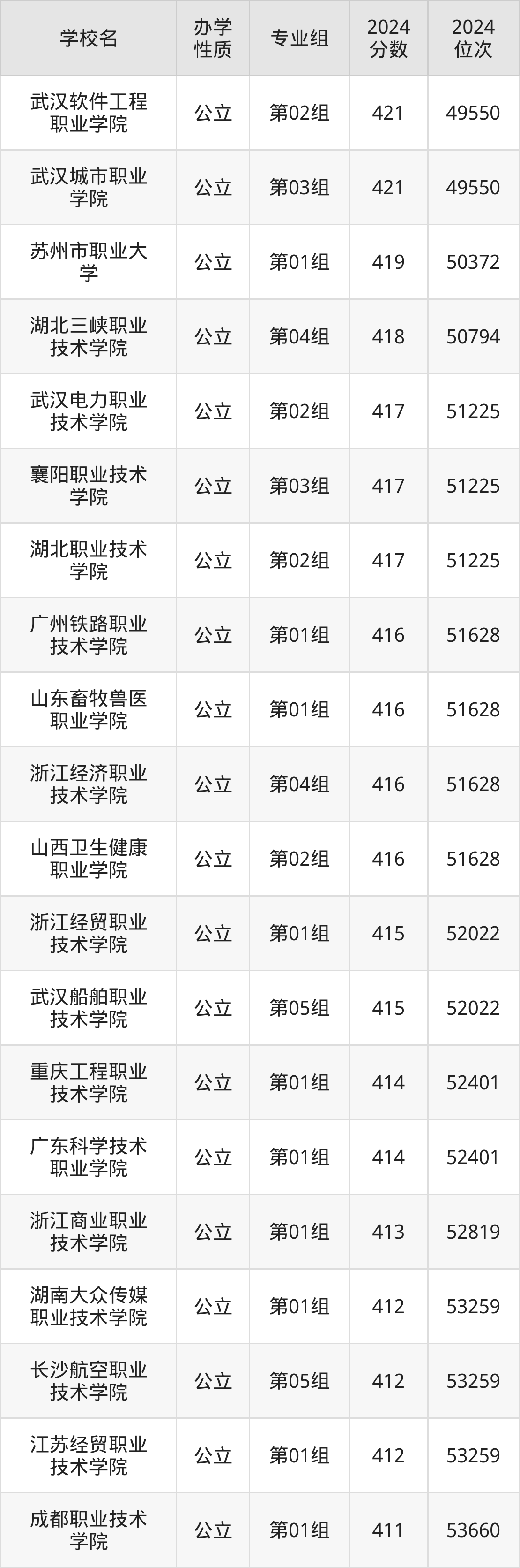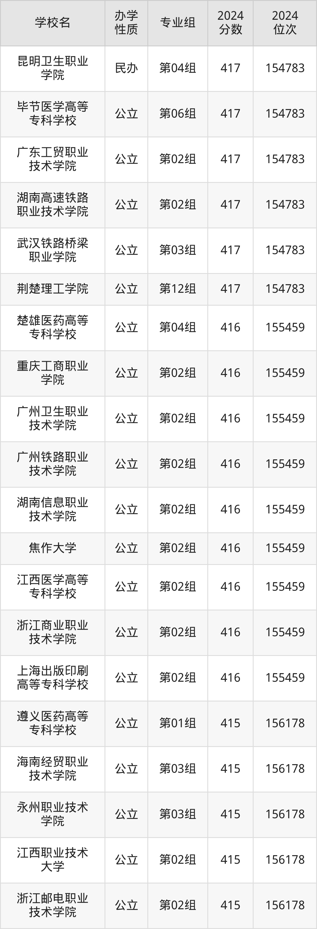 湖北416分左右的考生可以上武汉软件工程职业学院、武汉城市职业学院、苏州市职业大学等院校,刚好在416分的院校有广州铁路职业技术学院、山东畜牧兽医职业学院、浙江经济职业技术学院等。