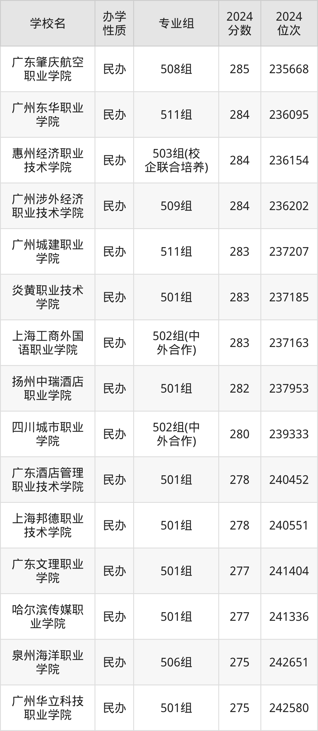 | 广州涉外经济 职业技术学院 | 511组(联 合培养) | 279 | 240099 |