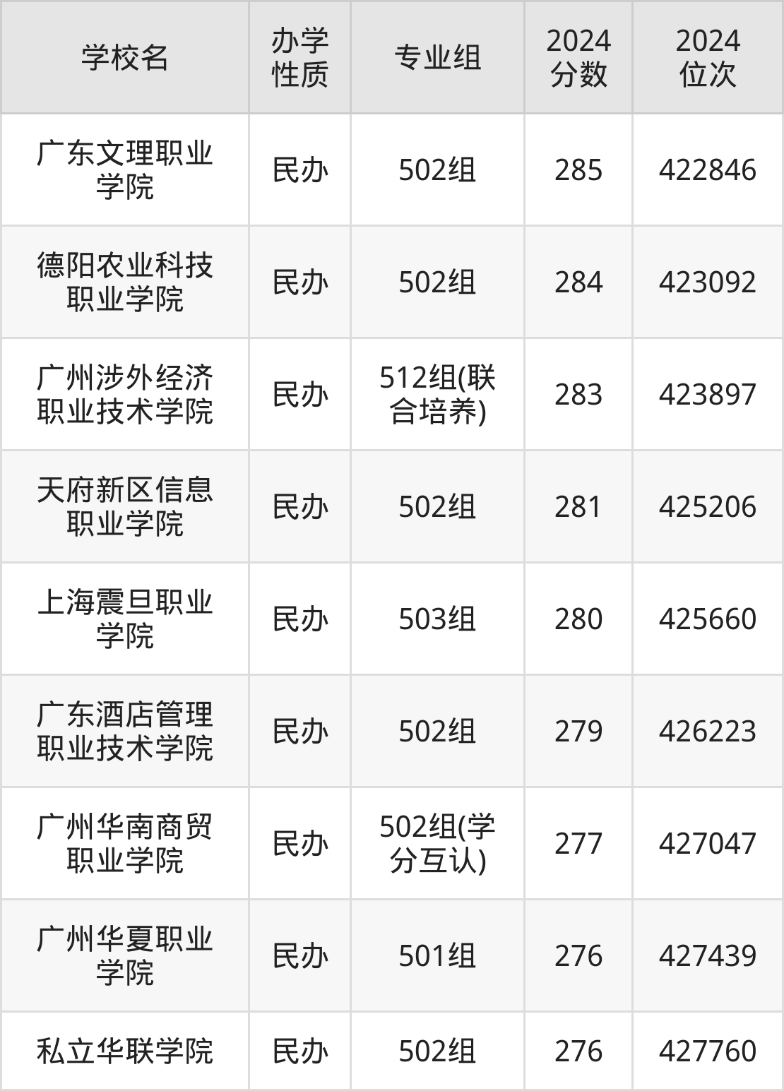 | 广州涉外经济 职业技术学院 | 512组(联 合培养) | 283 | 423897 |
