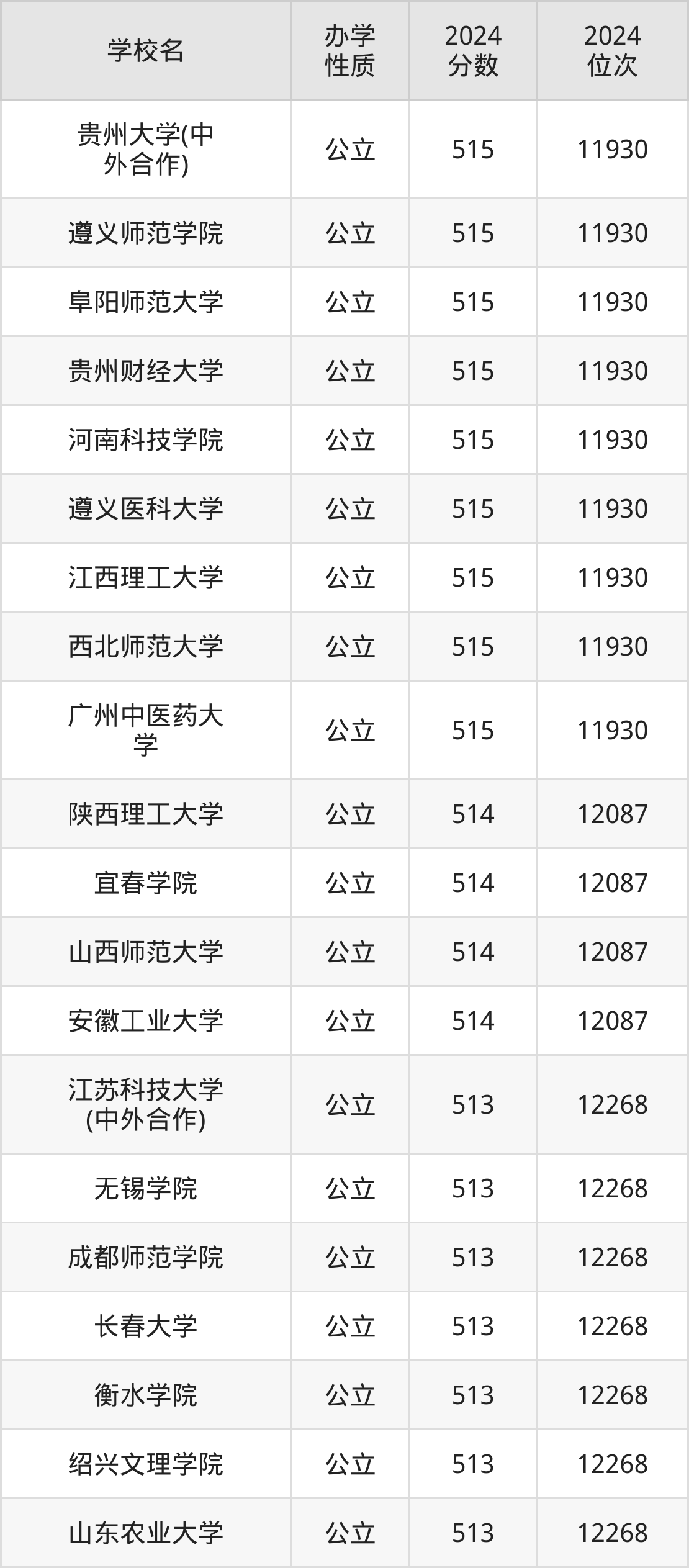 | 贵州大学(中 外合作) | 515 | 11930 |