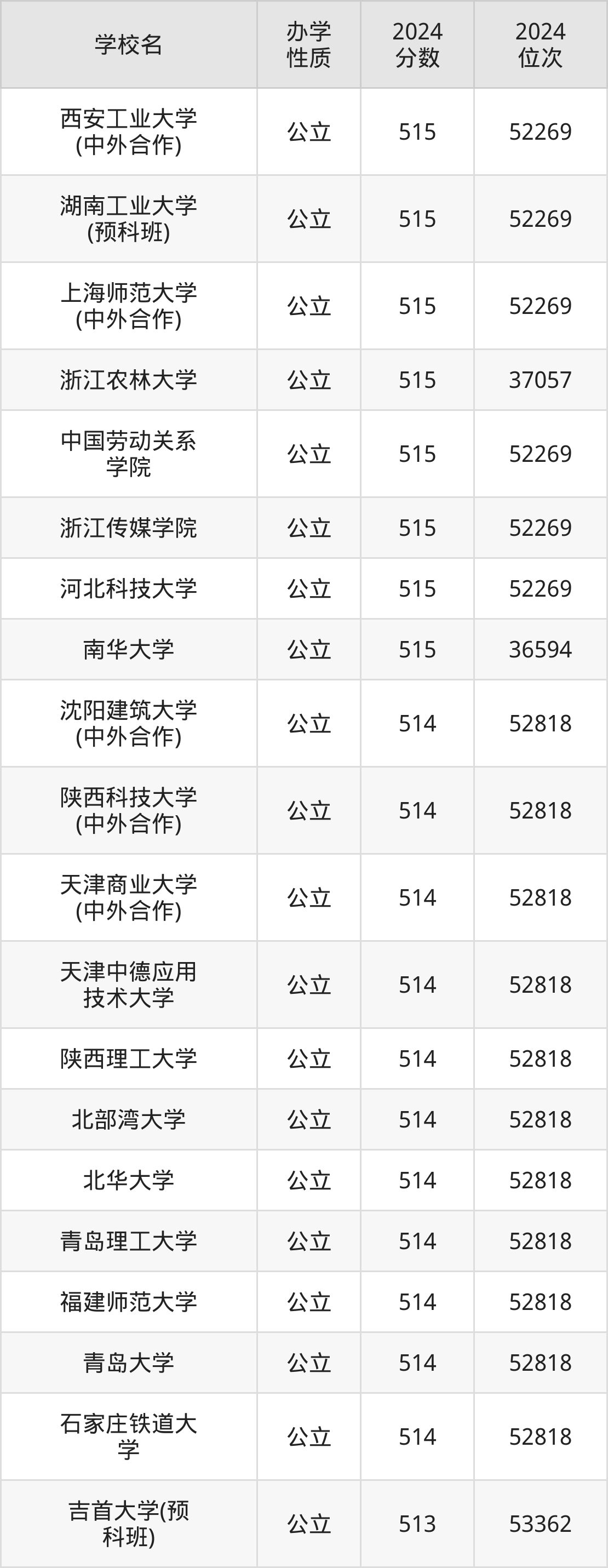 | 西安工业大学 (中外合作) | 515 | 52269 |