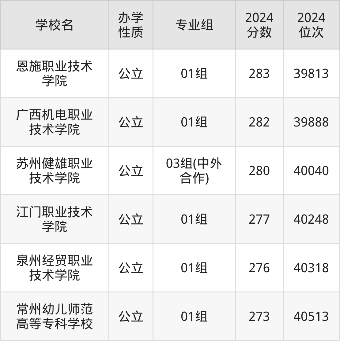 江苏省278分能上专科大学,比如恩施职业技术学院、广西机电职业技术学院、长江艺术工程职业学院等,更多名单可以在下文了解。
