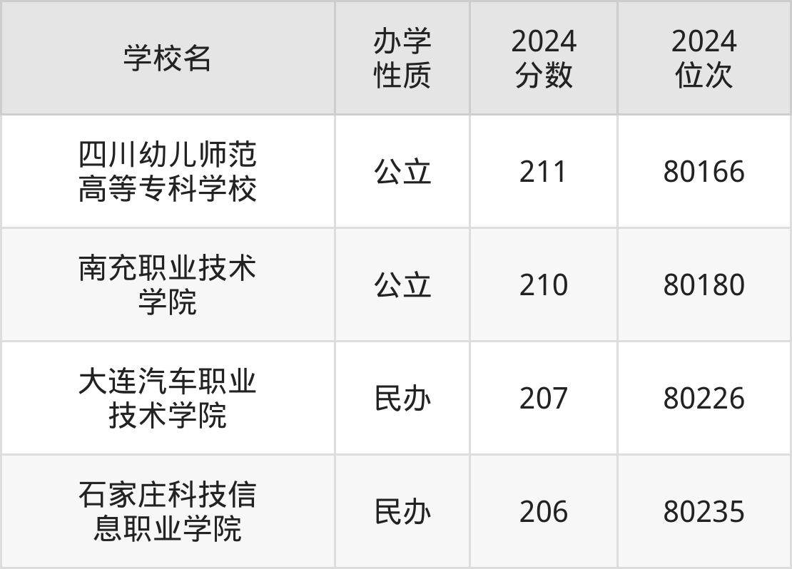 2024年陕西文科208分考生能上四川幼儿师范高等专科学校、南充职业技术学院、大连汽车职业技术学院、石家庄科技信息职业学院4所专科院校,具体录取分数线及位次为: