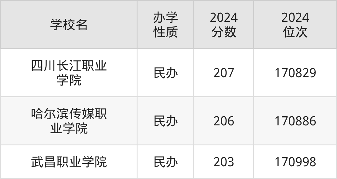 2024年陕西理科208分考生能上四川长江职业学院、哈尔滨传媒职业学院、武昌职业学院3所专科院校,具体录取分数线及位次为: