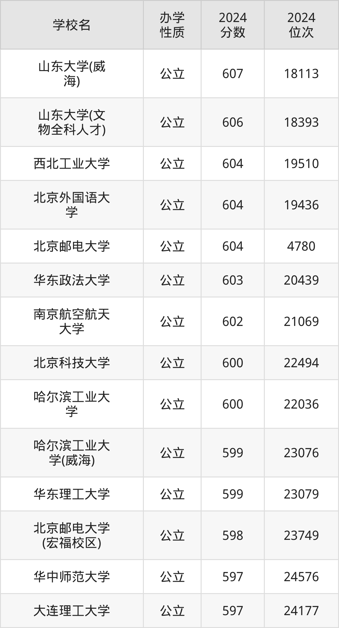 2024年山东602分考生能上大连理工大学、哈尔滨工业大学(威海)、哈尔滨工业大学、西北工业大学、山东大学(威海)5所985院校,具体录取分数线及位次为: