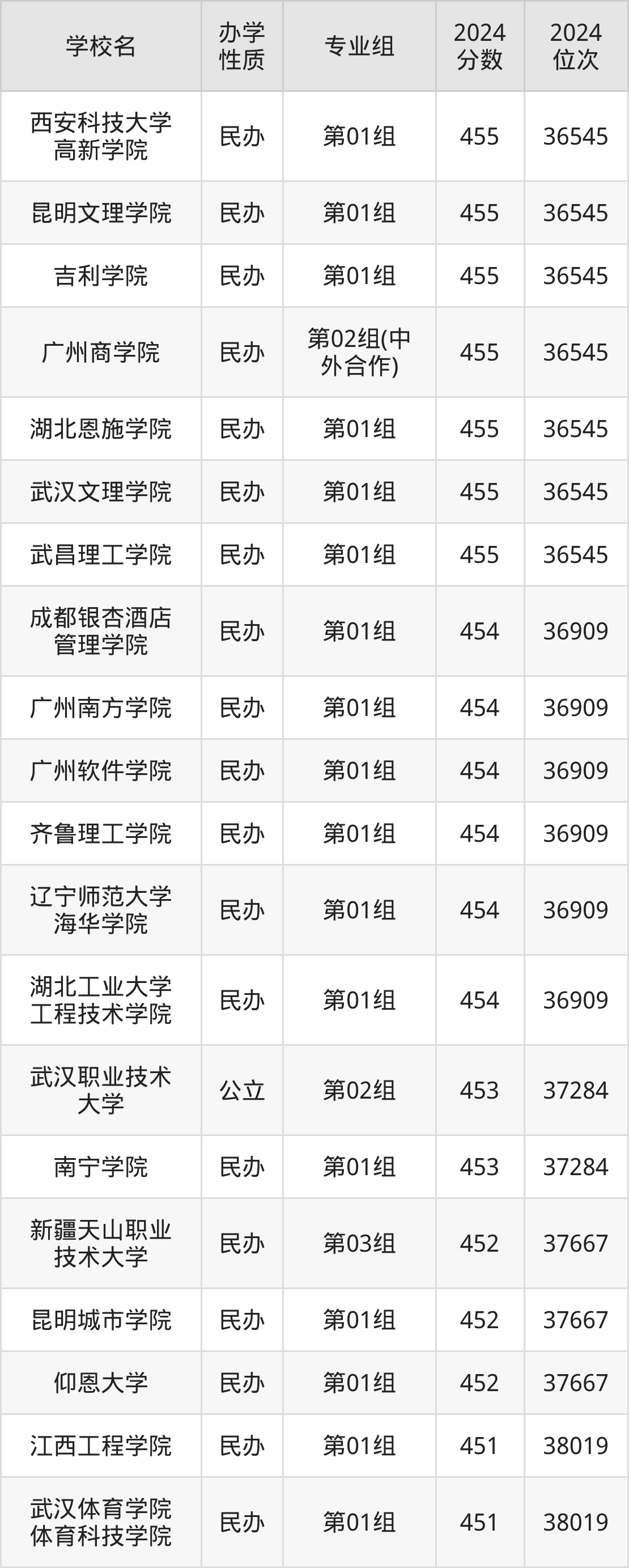 2024年湖北历史类450分考生能上西安科技大学高新学院、昆明文理学院、吉利学院、广州商学院、湖北恩施学院等36所二本院校,具体录取分数线及位次为: