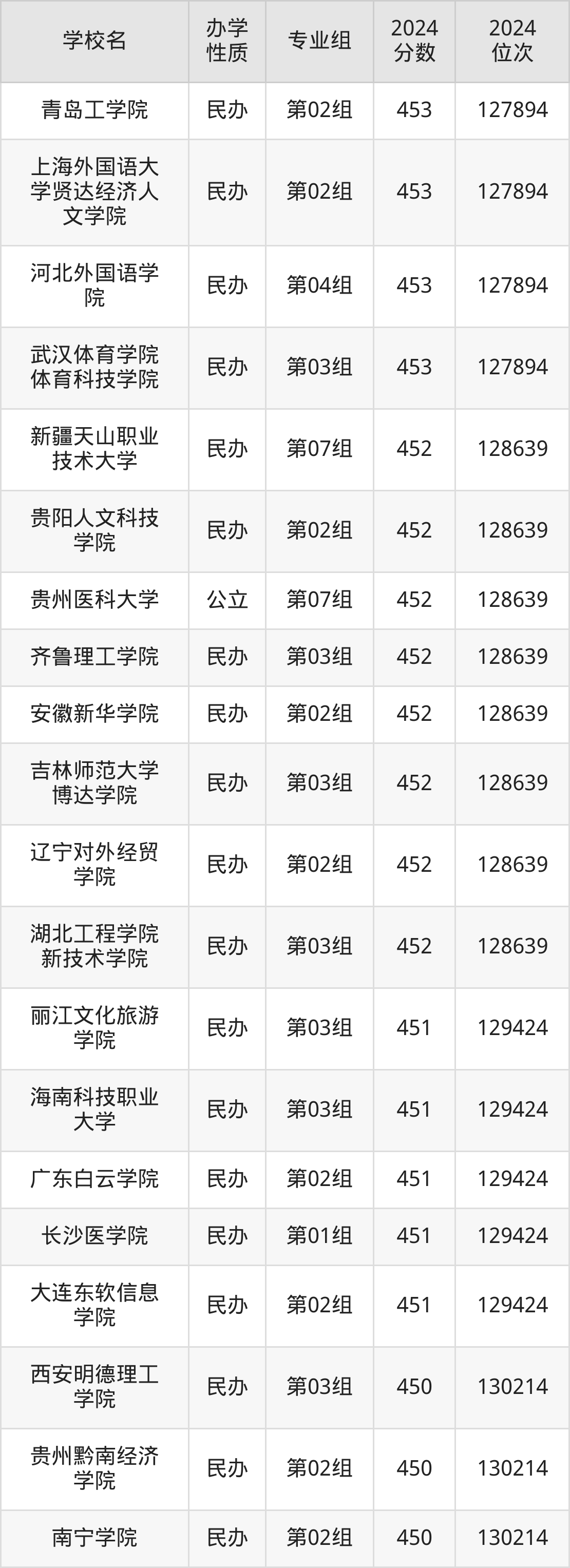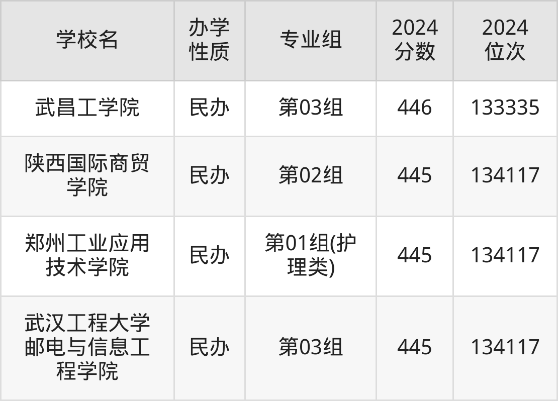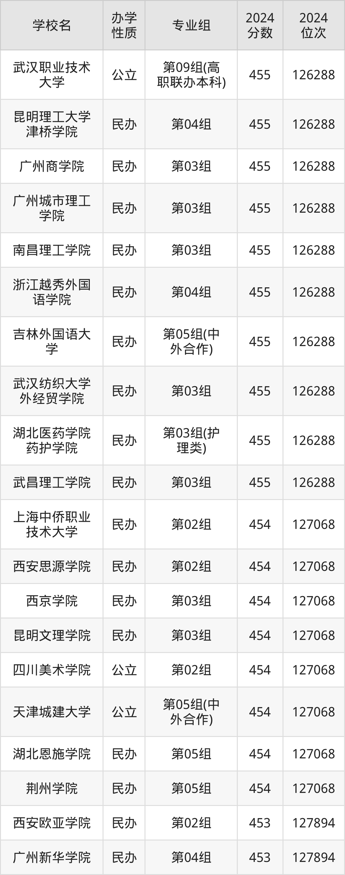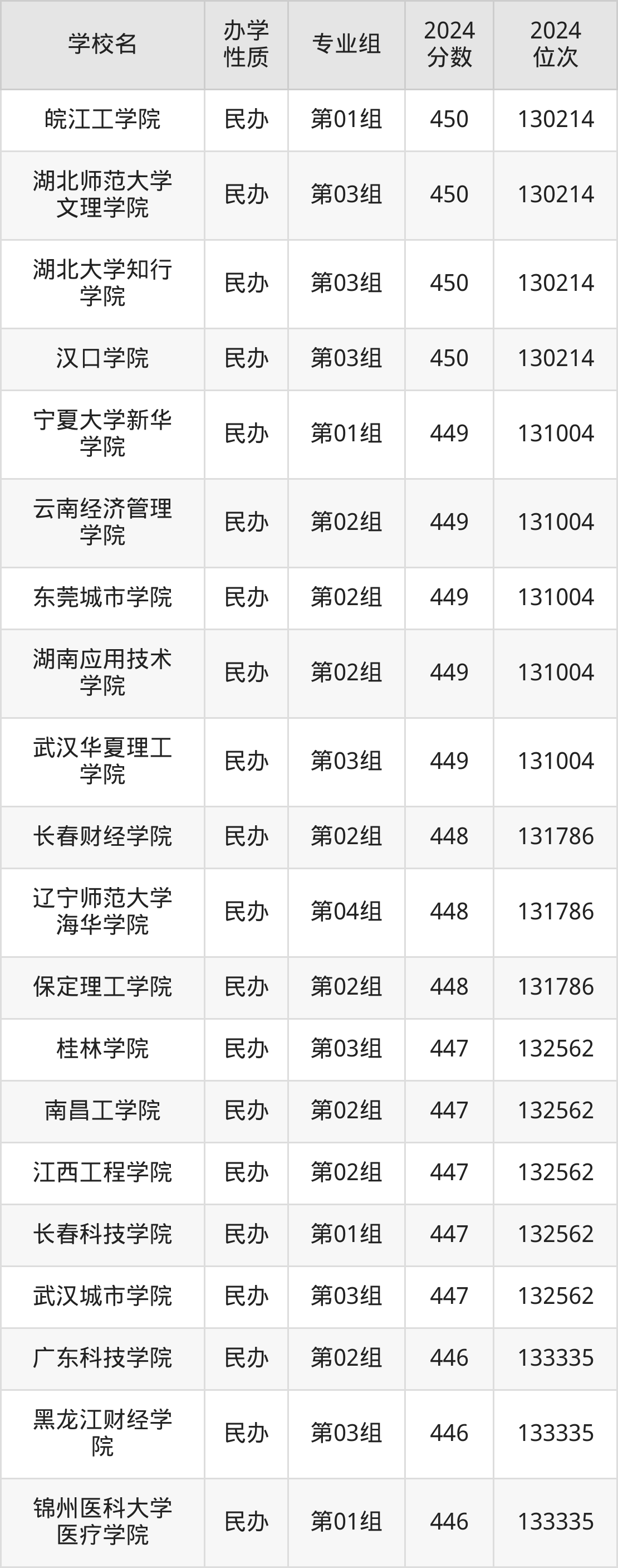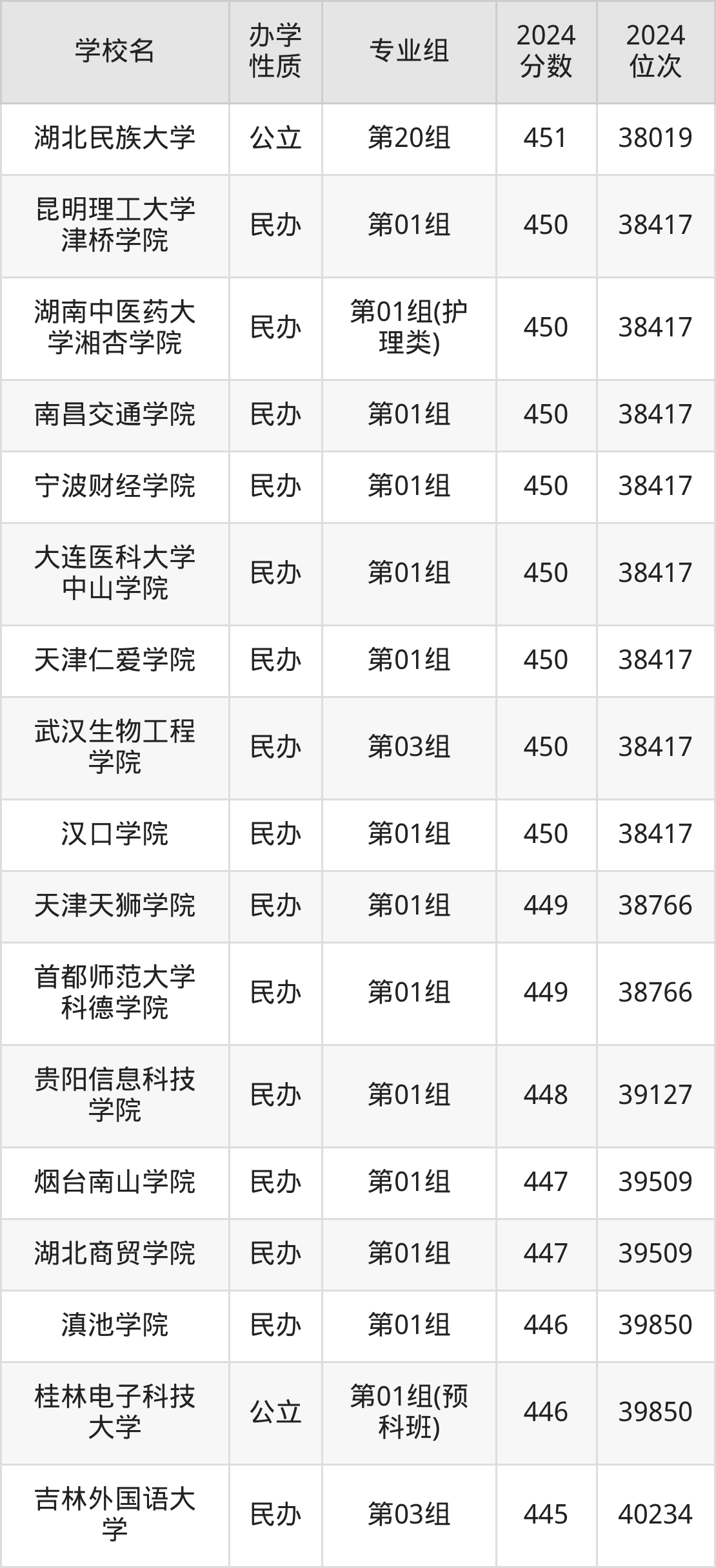 2024年湖北物理类450分考生能上昆明理工大学津桥学院、广州商学院、广州城市理工学院、南昌理工学院、浙江越秀外国语学院等63所二本院校,具体录取分数线及位次为:
