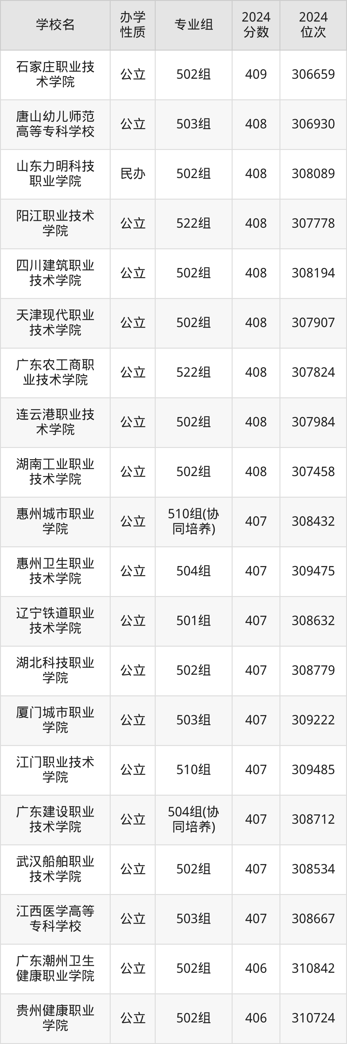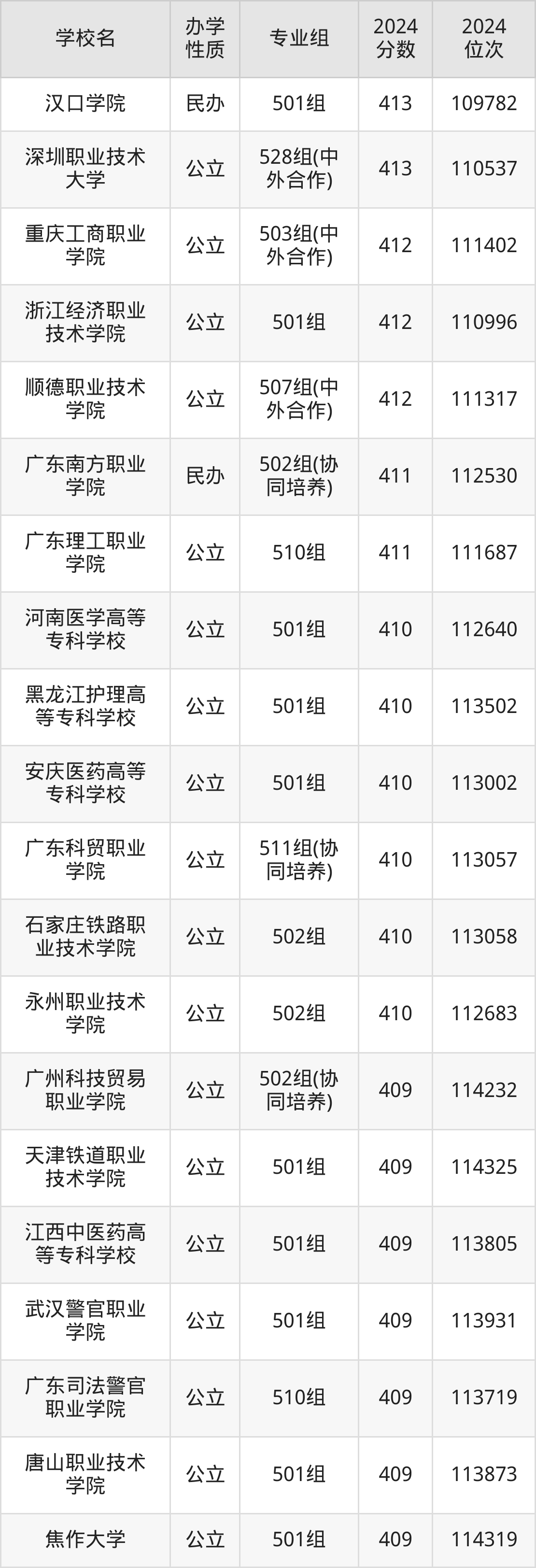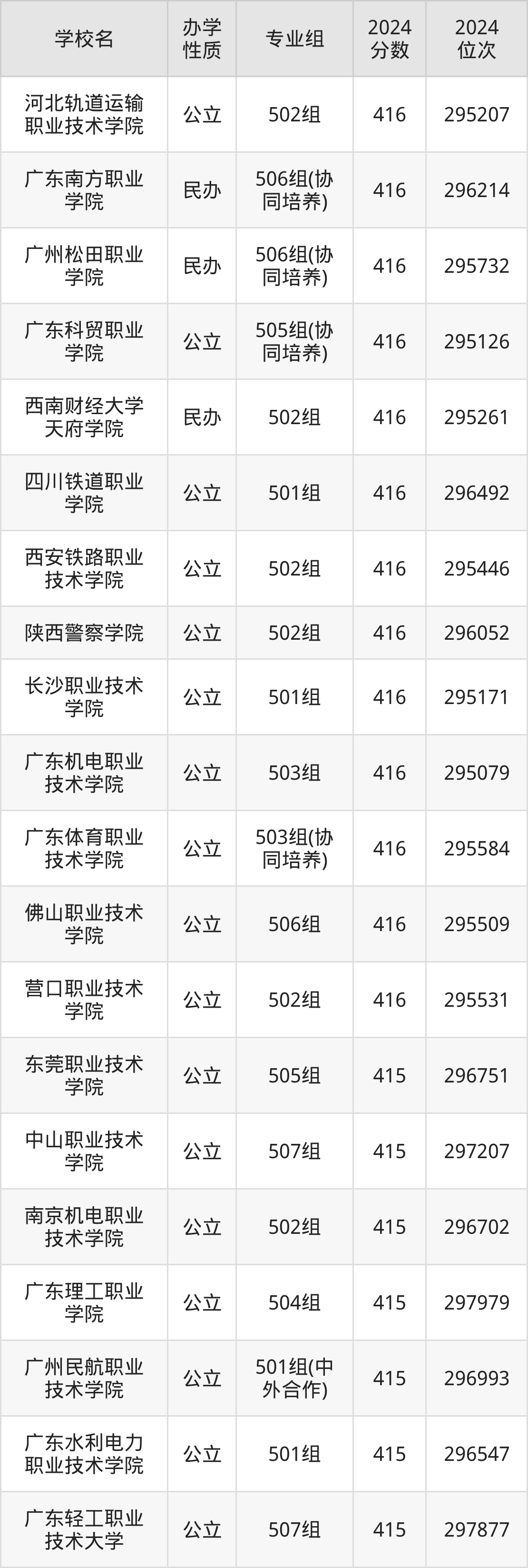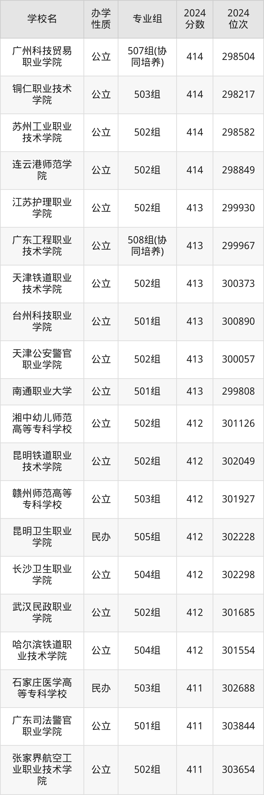 广东411分左右的考生可以上河北轨道运输职业技术学院、广东南方职业学院、广州松田职业学院等院校,刚好在411分的院校有石家庄医学高等专科学校、广东司法警官职业学院、张家界航空工业职业技术学院等。