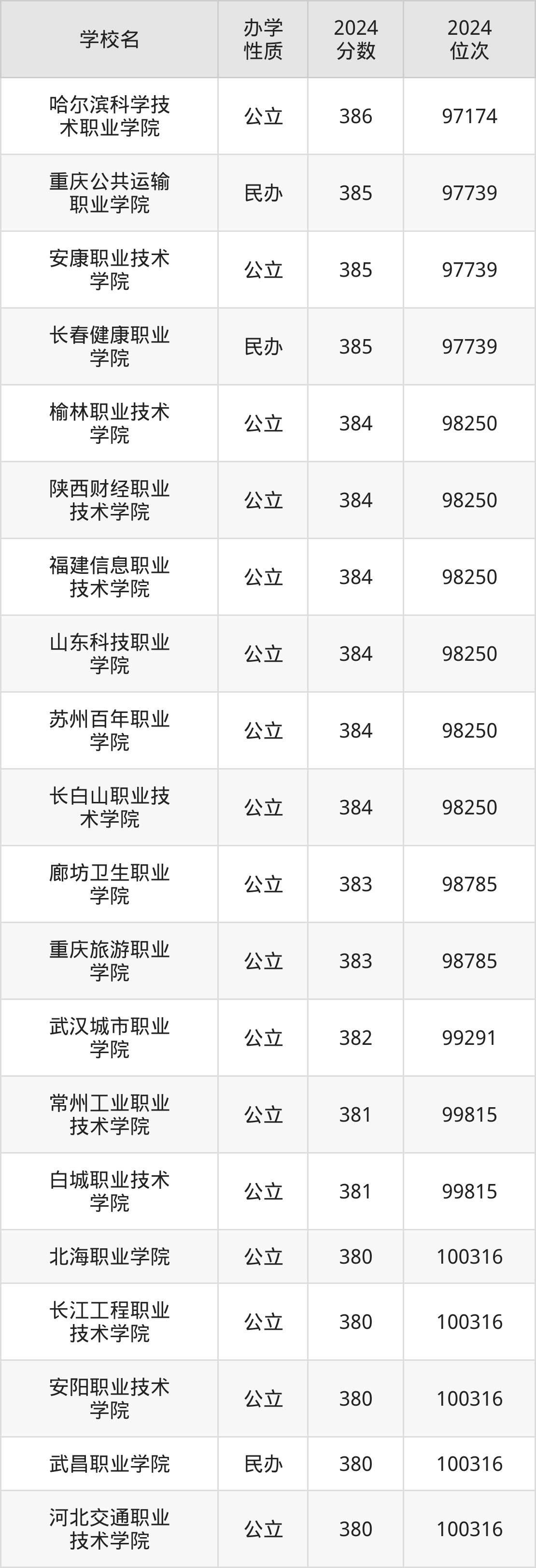 | 长春健康职业 学院 | 385 | 97739 |