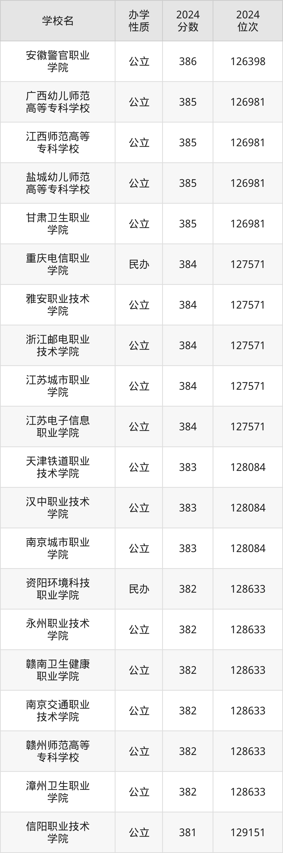 | 安徽警官职业 学院 | 386 | 126398 |