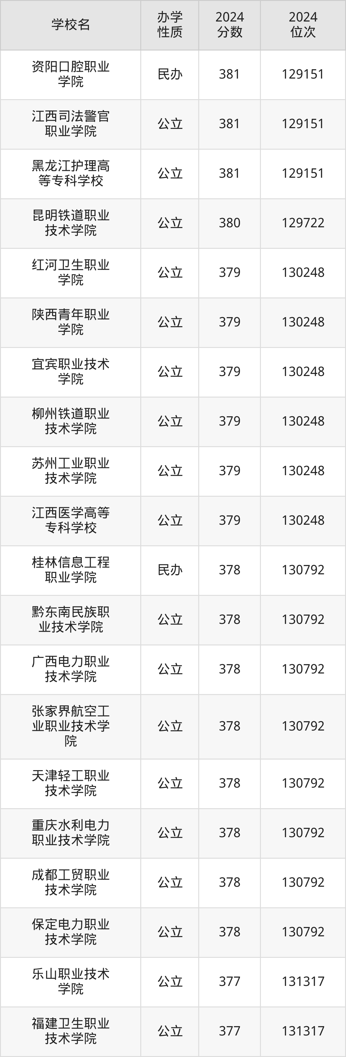 | 重庆电信职业 学院 | 384 | 127571 |