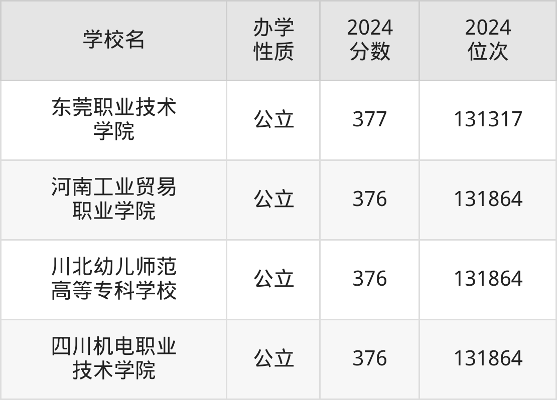 | 东莞职业技术 学院 | 377 | 131317 |
