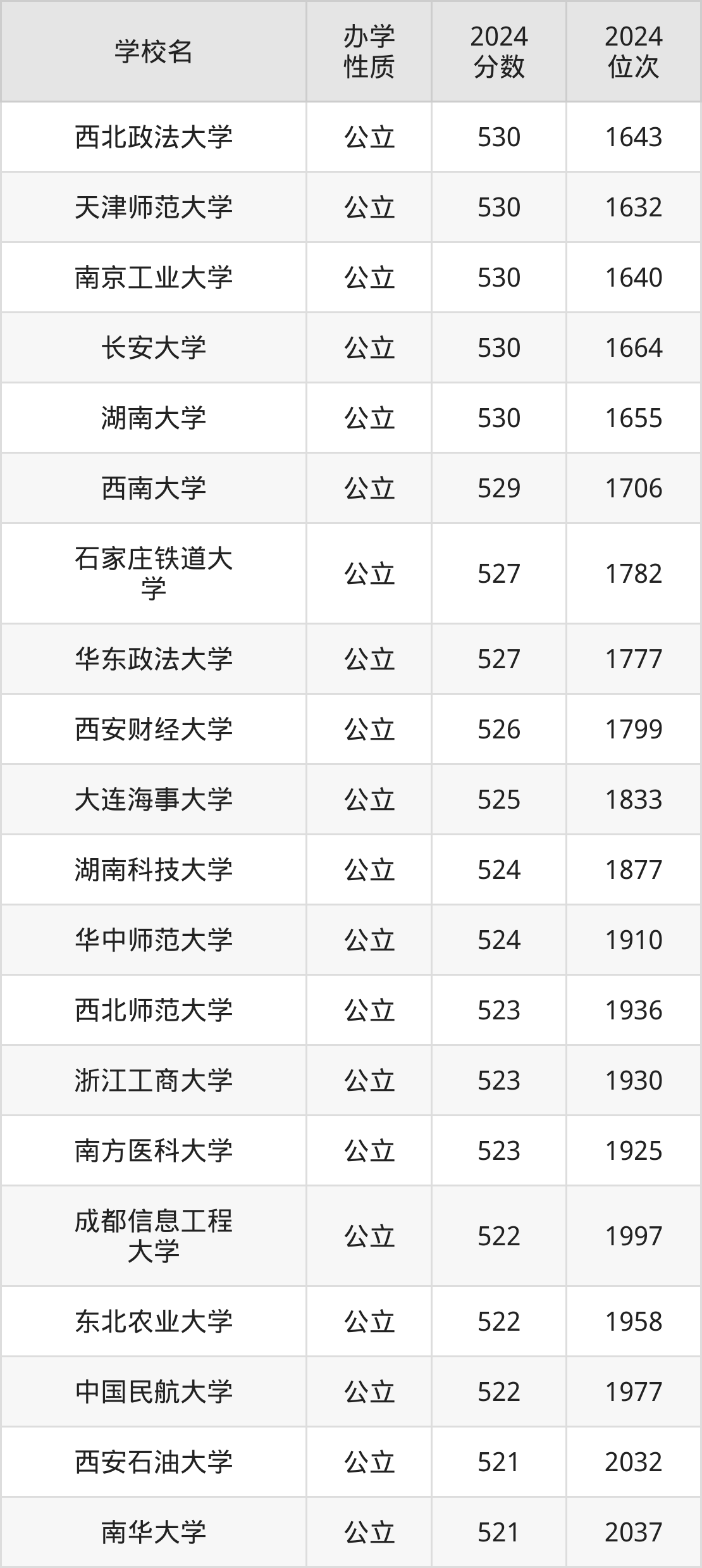 2024年宁夏文科525分考生能上西北政法大学、天津师范大学、长安大学、湖南大学、西南大学等22所一本院校,具体录取分数线及位次为: