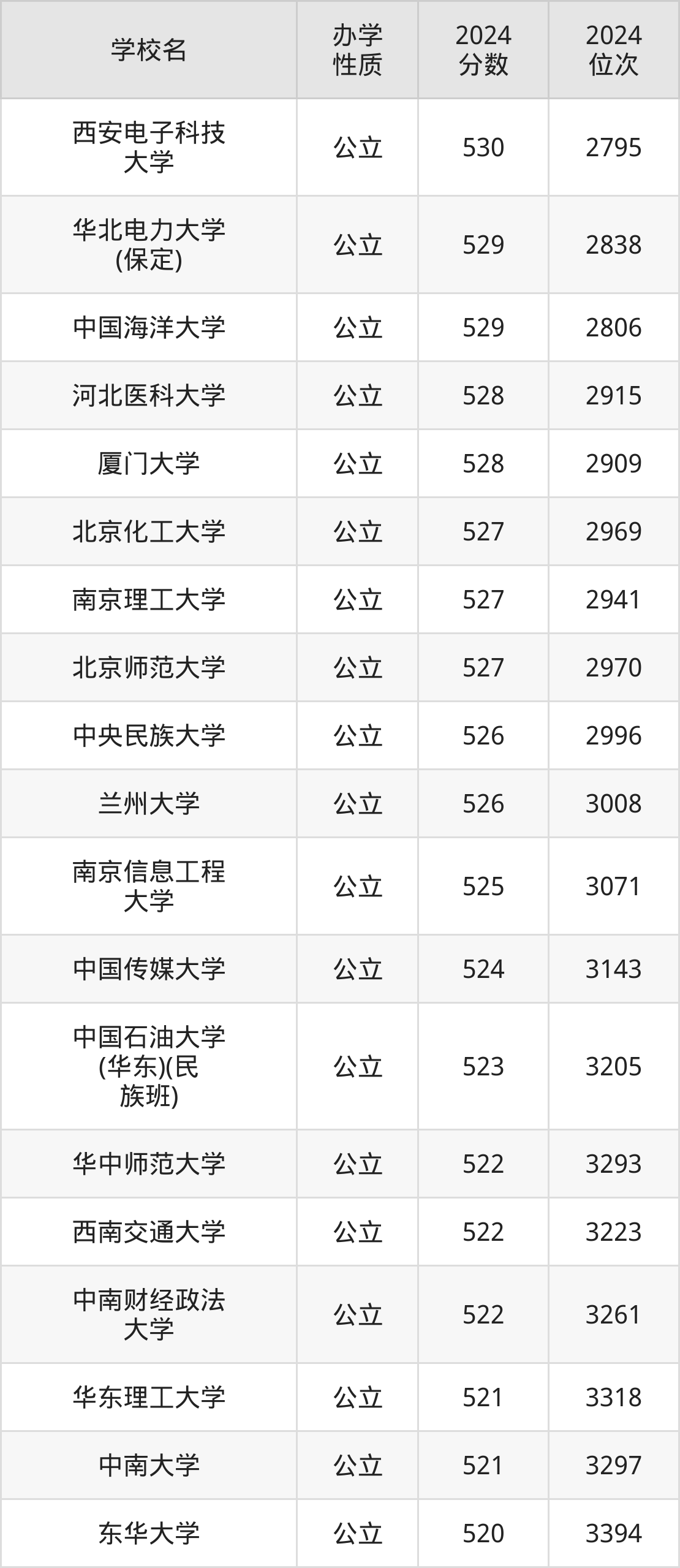 2024年宁夏理科525分考生能上西安电子科技大学、中国海洋大学、河北医科大学、北京化工大学、中央民族大学等13所一本院校,具体录取分数线及位次为: