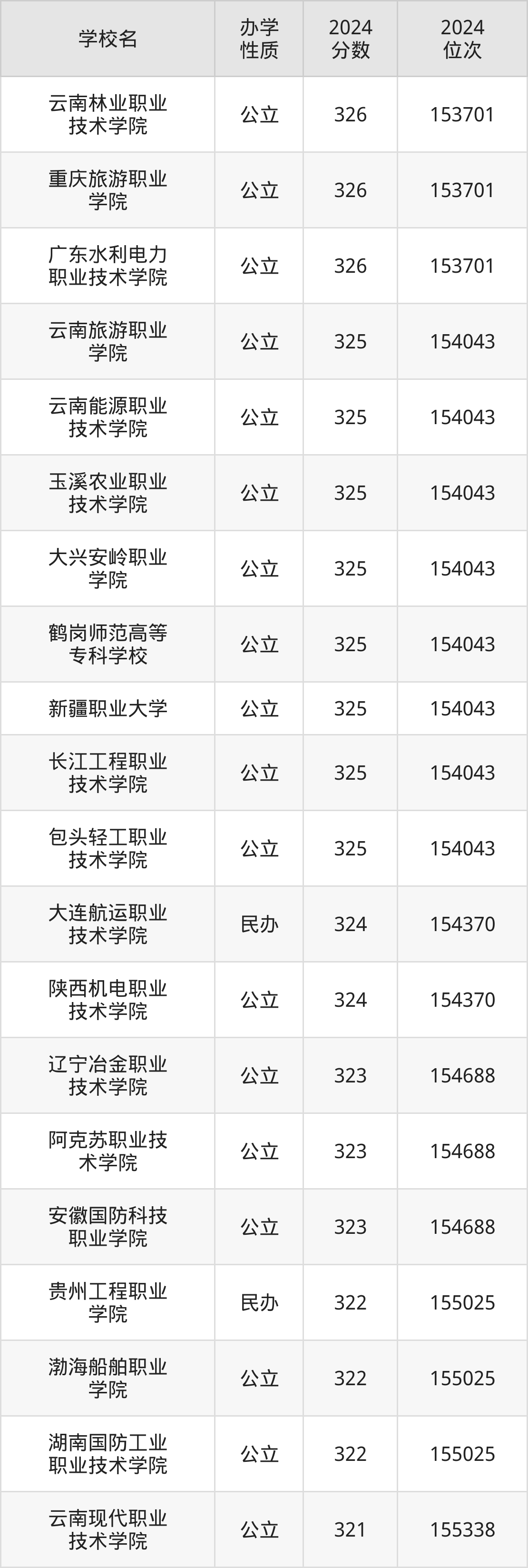 | 云南能源职业 技术学院 | 325 | 154043 |