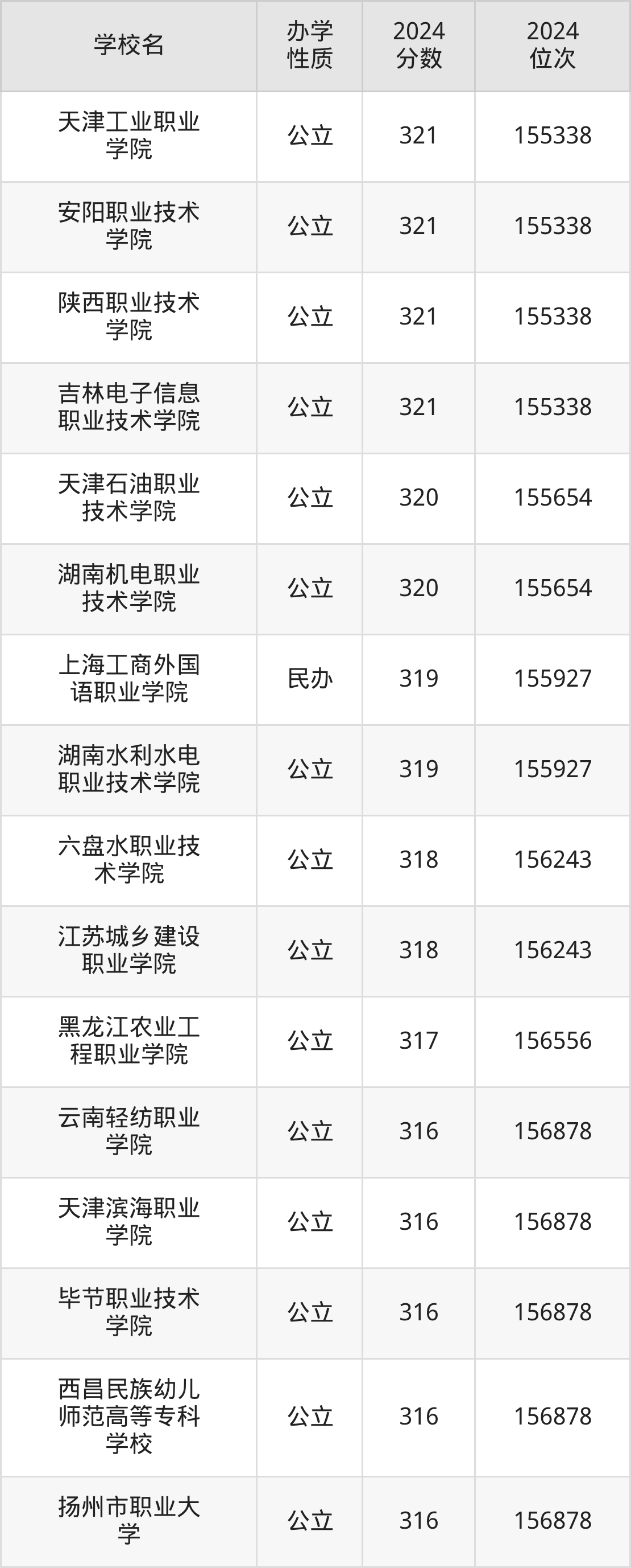 | 天津工业职业 学院 | 321 | 155338 |
