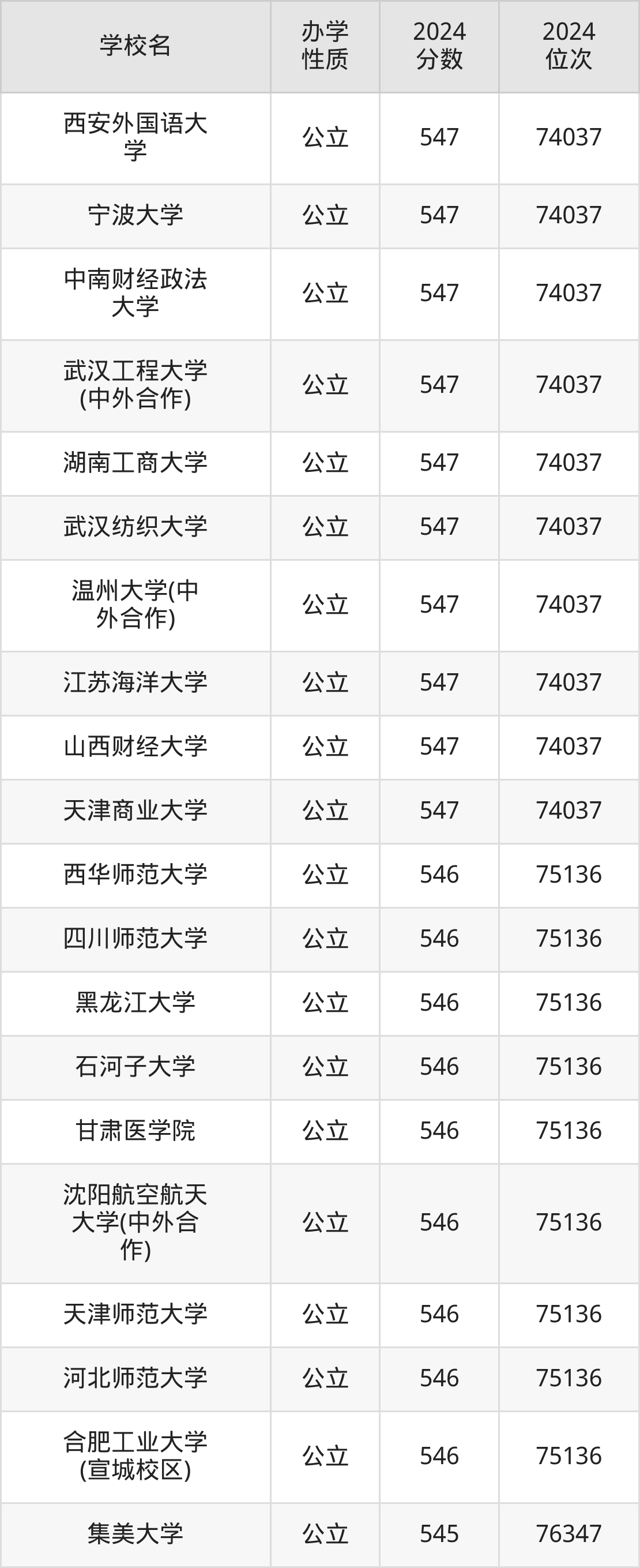 | 温州大学(中 外合作) | 547 | 74037 |