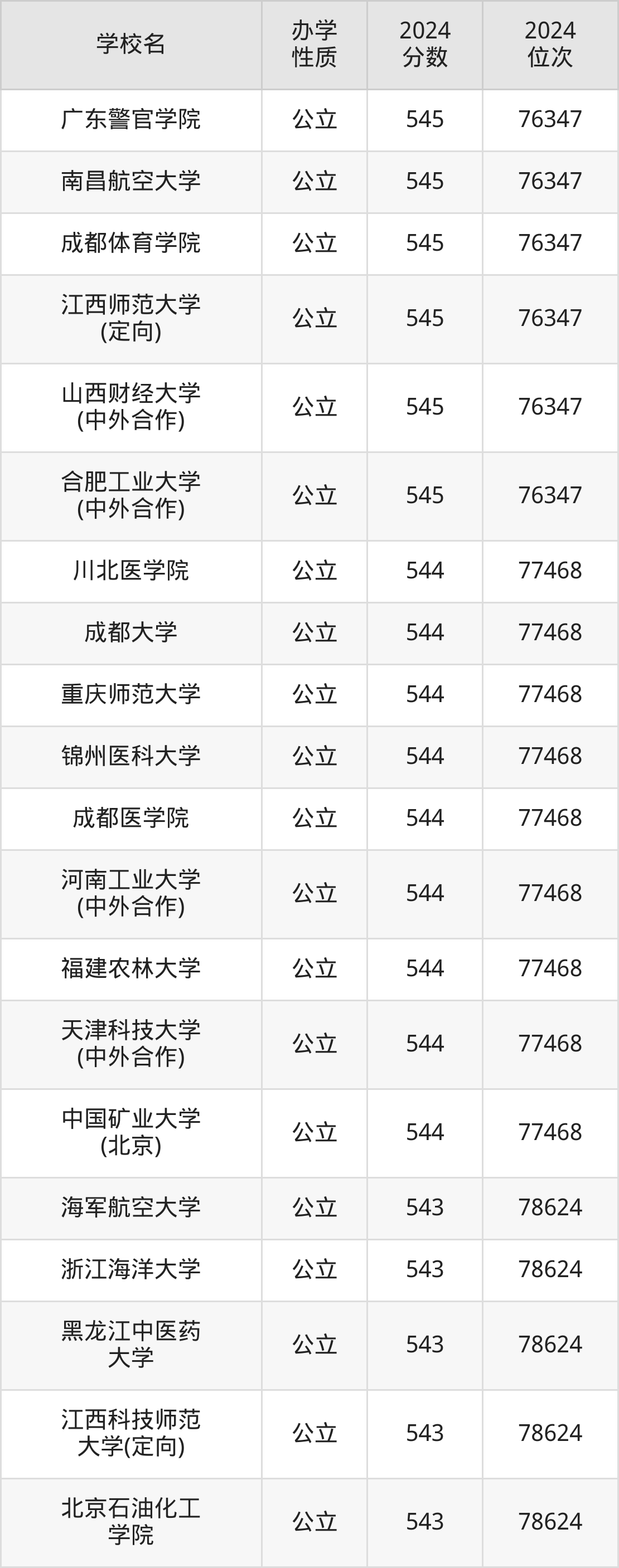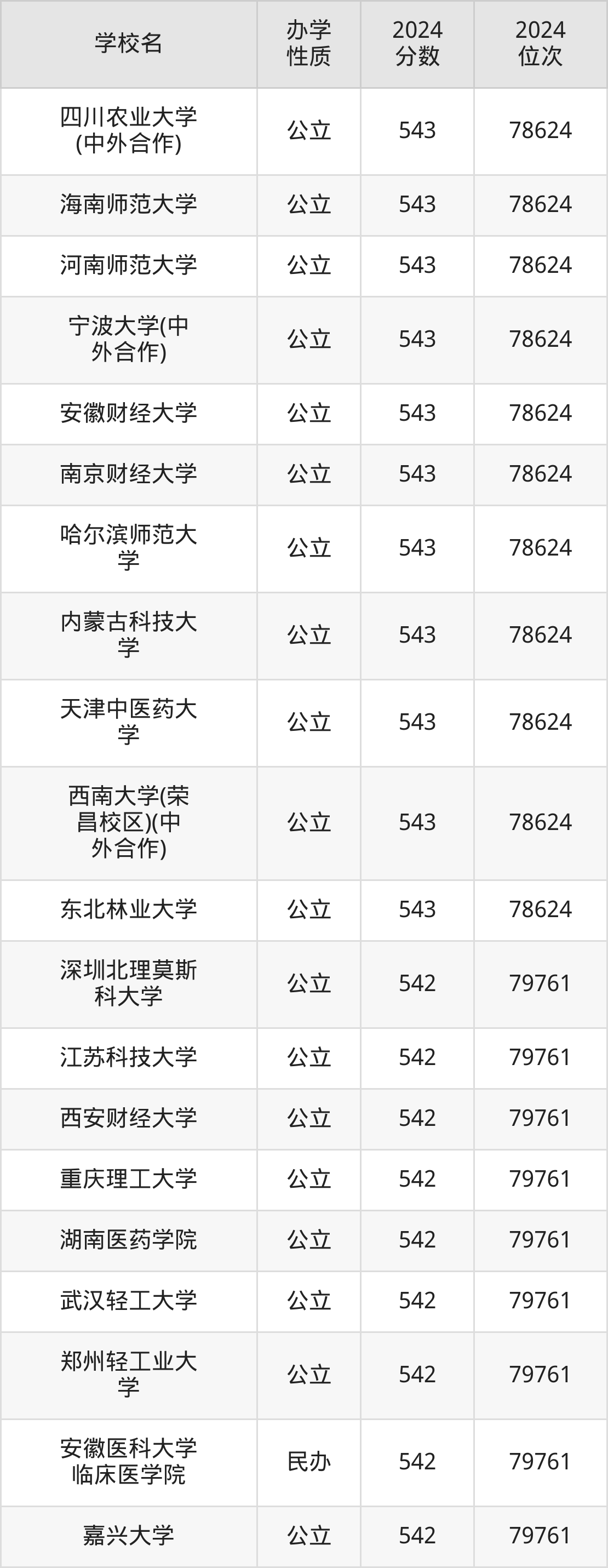 | 四川农业大学 (中外合作) | 543 | 78624 |