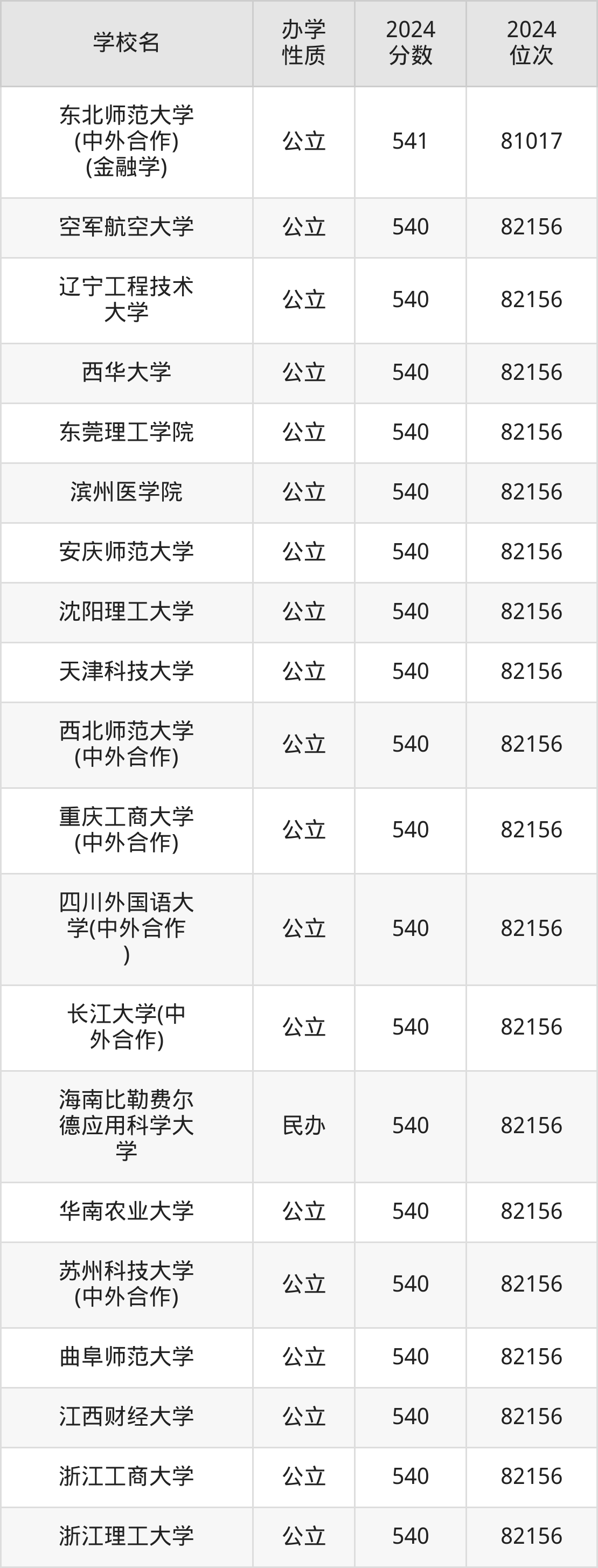 | 东北师范大学 (中外合作) (金融学) | 541 | 81017 |
