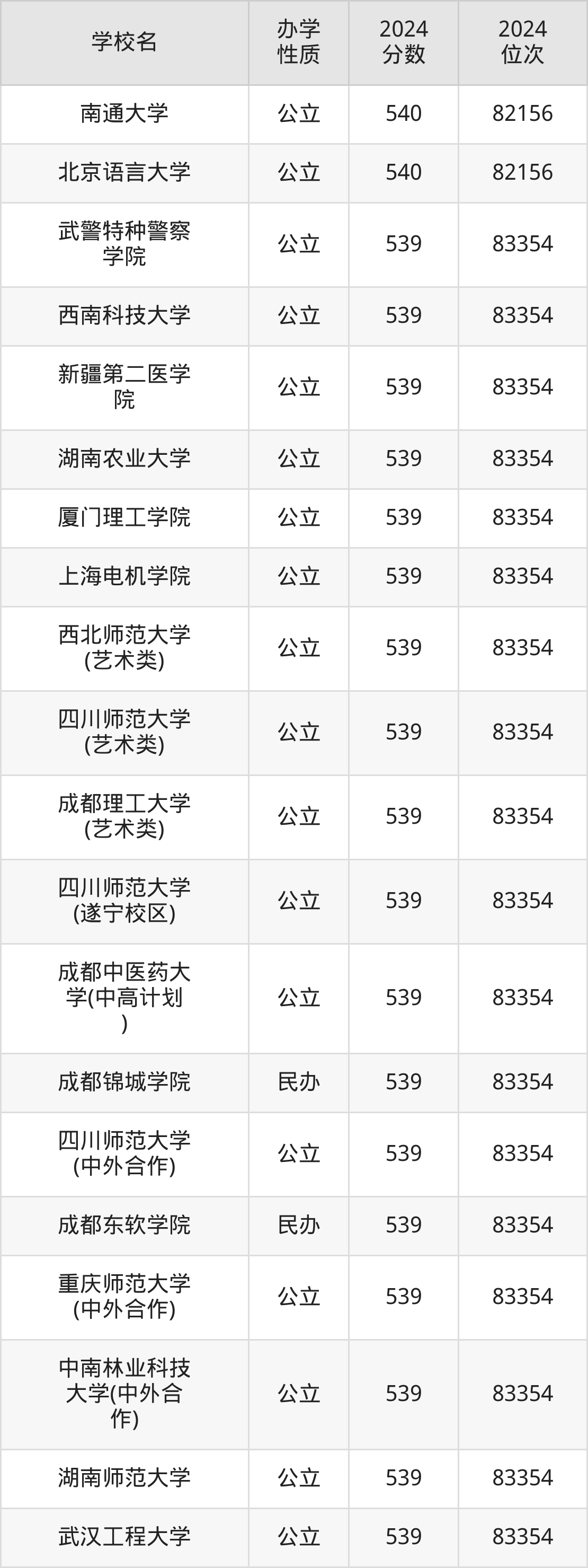 | 四川师范大学 (艺术类) | 539 | 83354 |