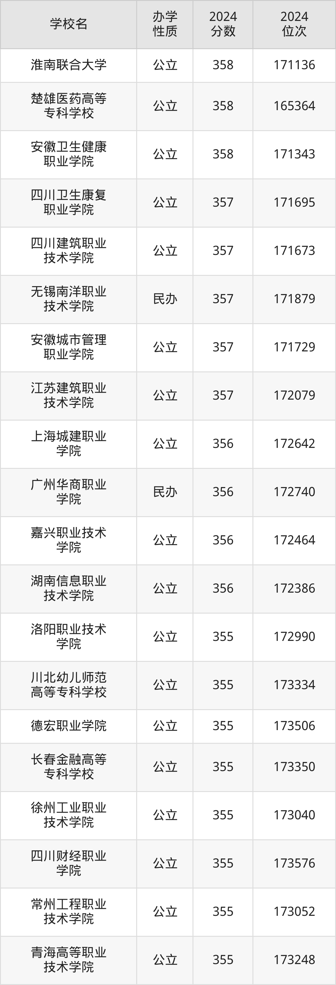 | 安徽卫生健康 职业学院 | 358 | 171343 |