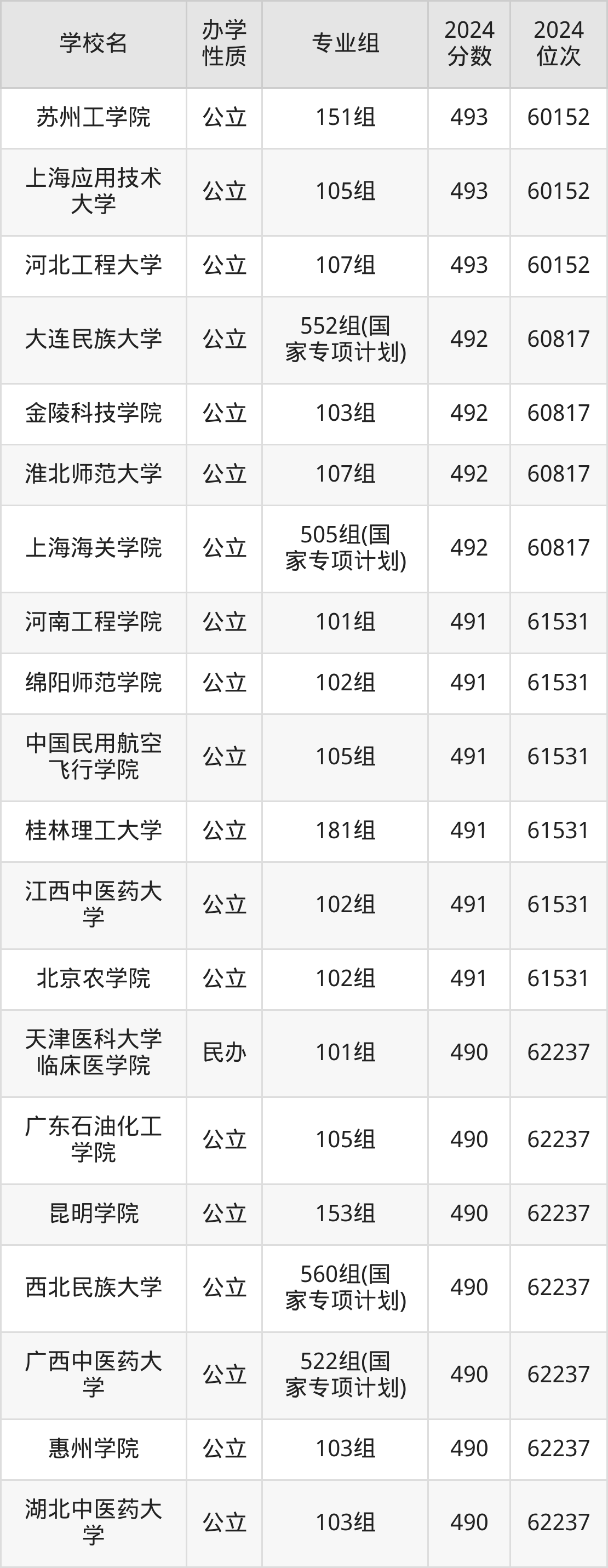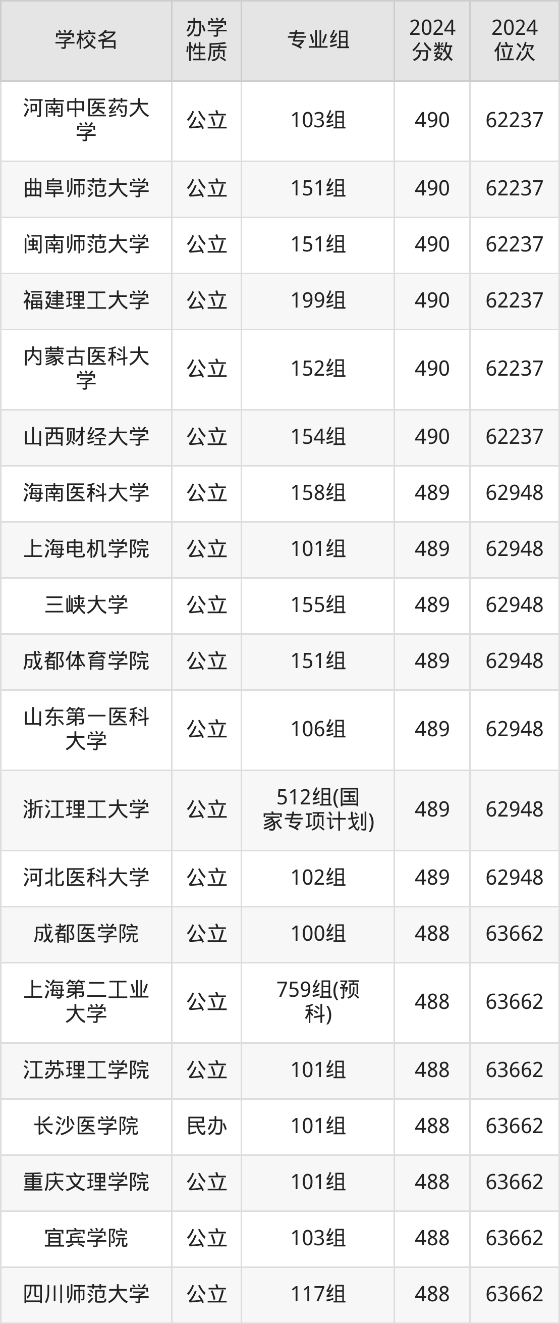 | 广西中医药大 学 | 522组(国 家专项计划) | 490 | 62237 |