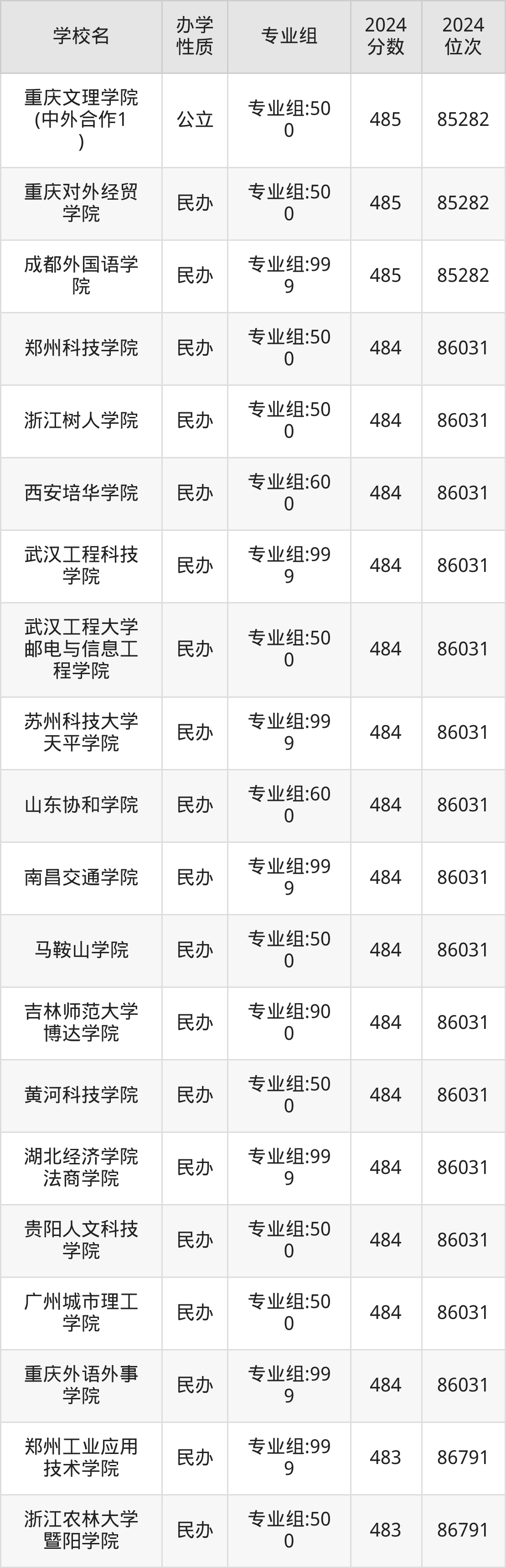 | 重庆文理学院 (中外合作2 ) | 专业组:50 0 | 479 | 89779 |